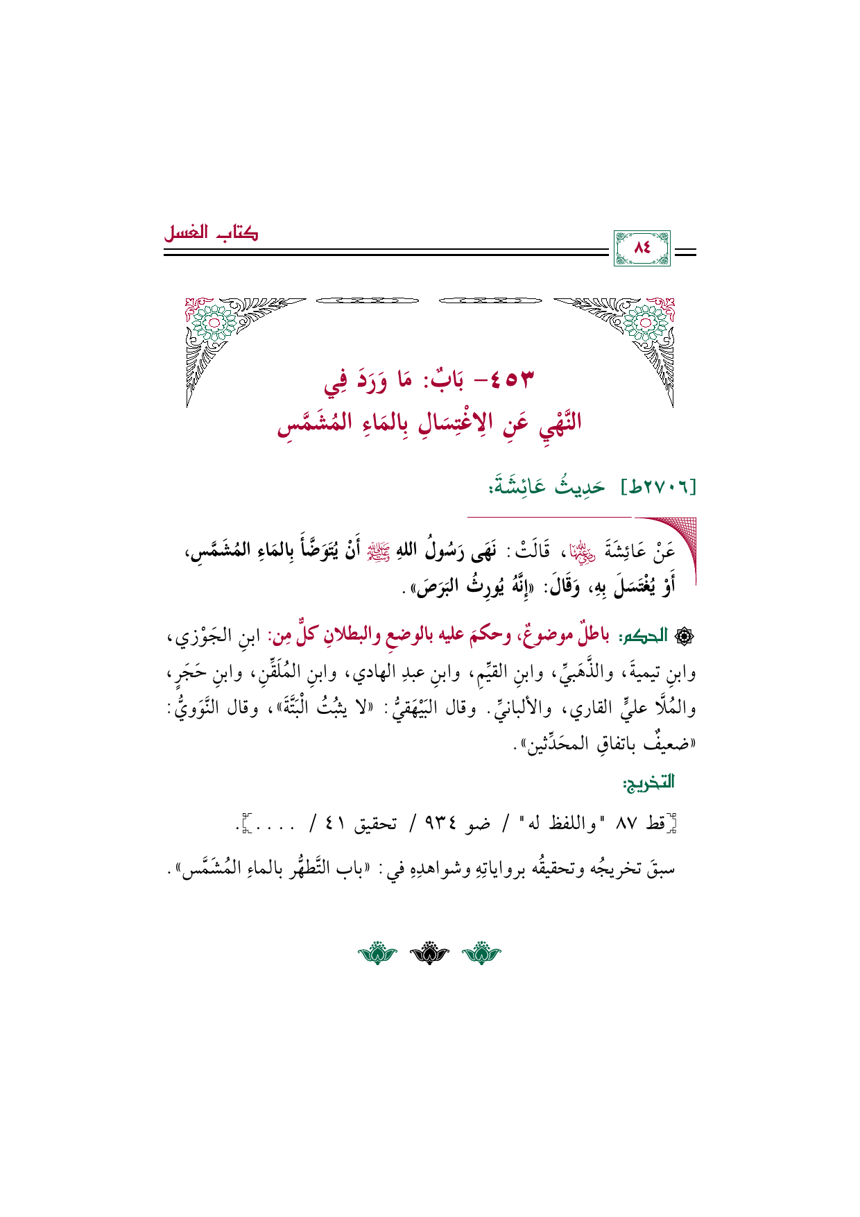 ٤٥٣ - بَابٌ: مَا وَرَدَ فِي النَّهْيِ عَنِ الِاغْتِسَالِ بِالمَاءِ المُشَمَّسِ