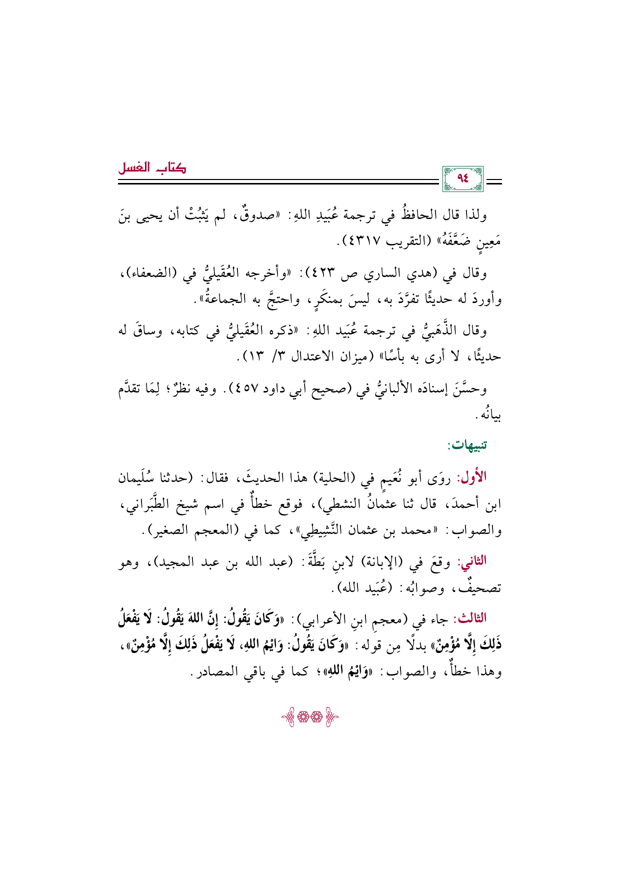 ولذا قال الحافظُ في ترجمة عُبَيدِ اللهِ: "صدوقٌ، لم يَثبُتْ أن يحيى بنَ مَعِينٍ ضَعَّفَهُ" (التقريب ٤٣١٧).