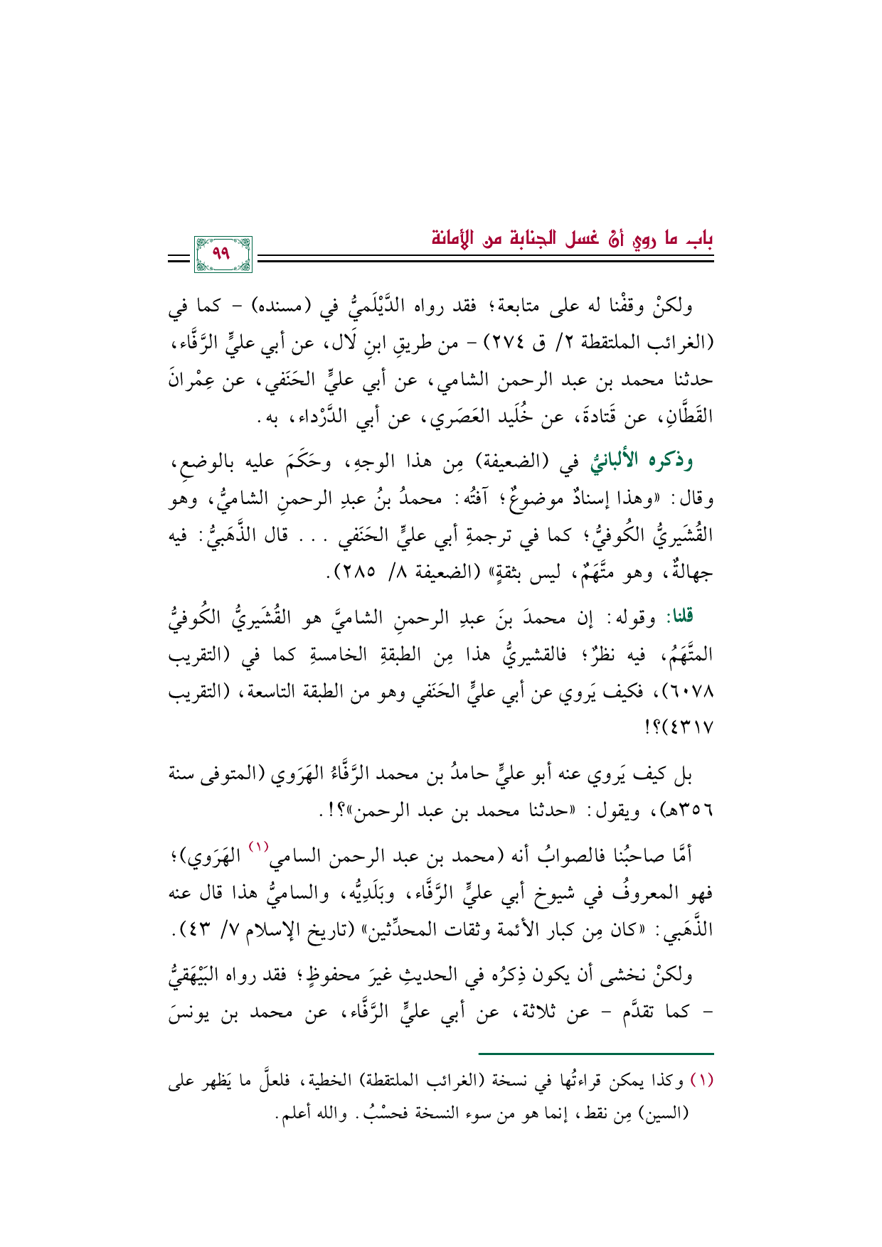 قلنا: وقوله: إن محمدَ بنَ عبدِ الرحمنِ الشاميَّ هو القُشَيريُّ الكُوفيُّ المتَّهَمُ، فيه نظرٌ؛ فالقشيريُّ هذا مِن الطبقةِ الخامسةِ كما في (التقريب ٦٠٧٨)، فكيف يَروي عن أبي عليٍّ الحَنَفي وهو من الطبقة التاسعة، (التقريب ٤٣١٧)؟ !
