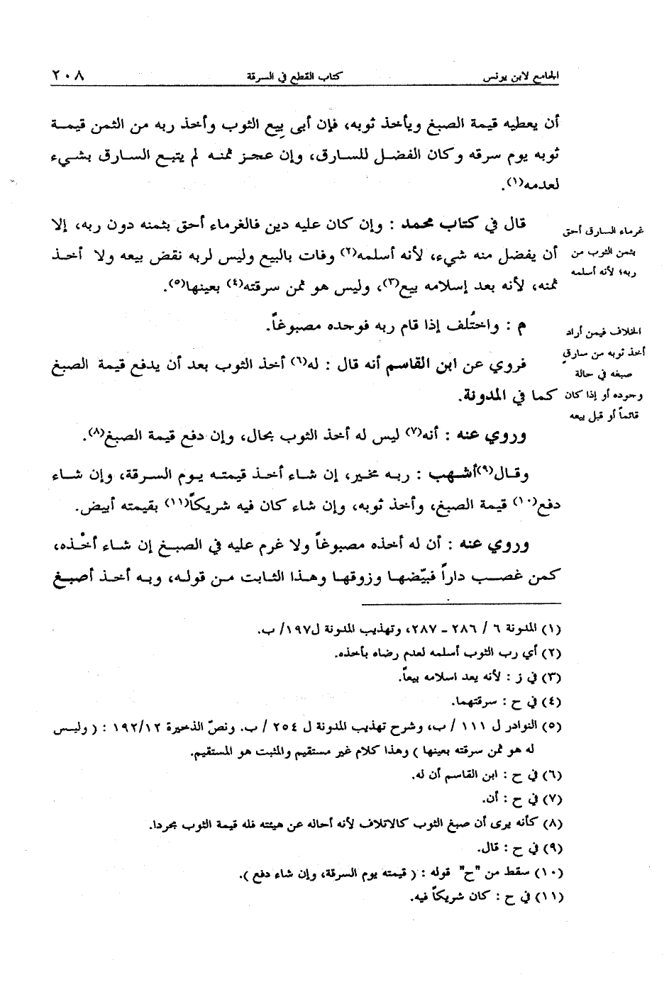 أن يعطيه قيمة الصبغ ويأخذ ثوبه, فإن أبى بِيع الثوب وأخذ ربه من الثمن قيمة ثوبه يوم سرقه وكان الفضل للسارق, وإن عجز ثمنه لم يتبع السارق بشيء لعدمه.