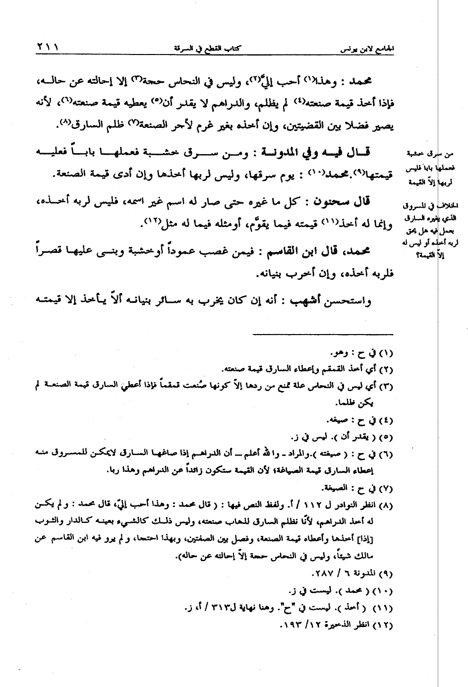 محمد: وهذا أحب إليَّ, وليس في النحاس حجة إلا إحالته عن حاله, فإذا أخذ قيمة صنعته لم يظلم, والدراهم لا يقدر أن يعطيه قيمة صنعته, لأن يصير فضلا بين القضيتين, وإن أخذه بغير غرم لأجر الصنعة ظلم السارق.