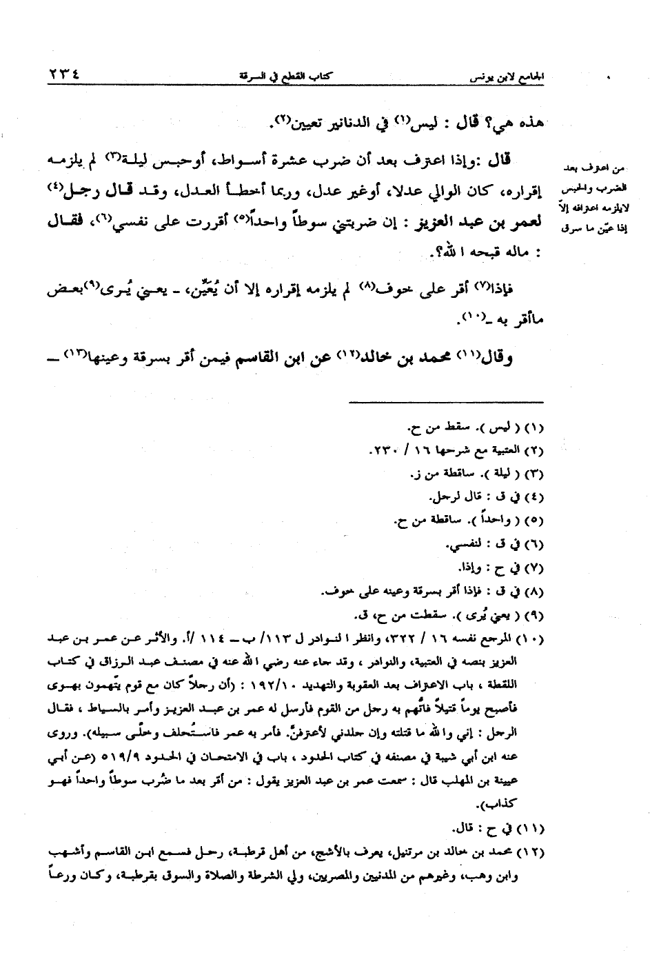 قال: وإذا اعترف بعد أن ضرب عشرة أسواط، أو حبس ليلة لم يلزمه إقراره، كان الوالي عدلاً، أو غير عدل، وربما أخطأ العدل، وقد قال رجل لعمر بن عبد العزيز: إن ضربتي سوطاً واحداً أقررت على نفسي، فقال: ماله قبحه الله؟