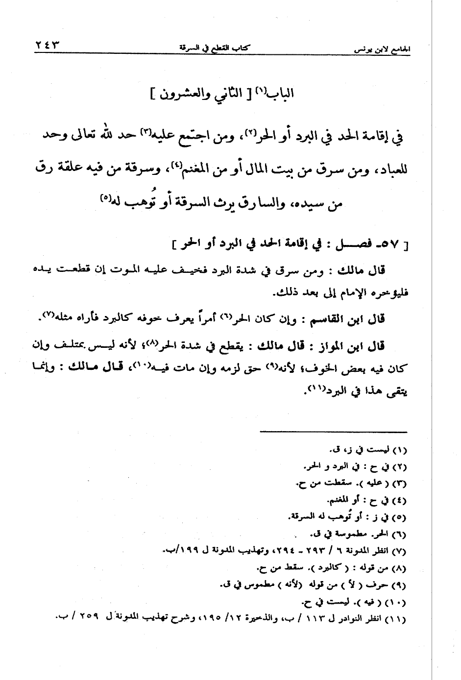 قال مالك: ومن سرق في شدة البرد فخيف عليه الموت إن قطعت يده فليؤخره الإمام إلى بعد ذبك.