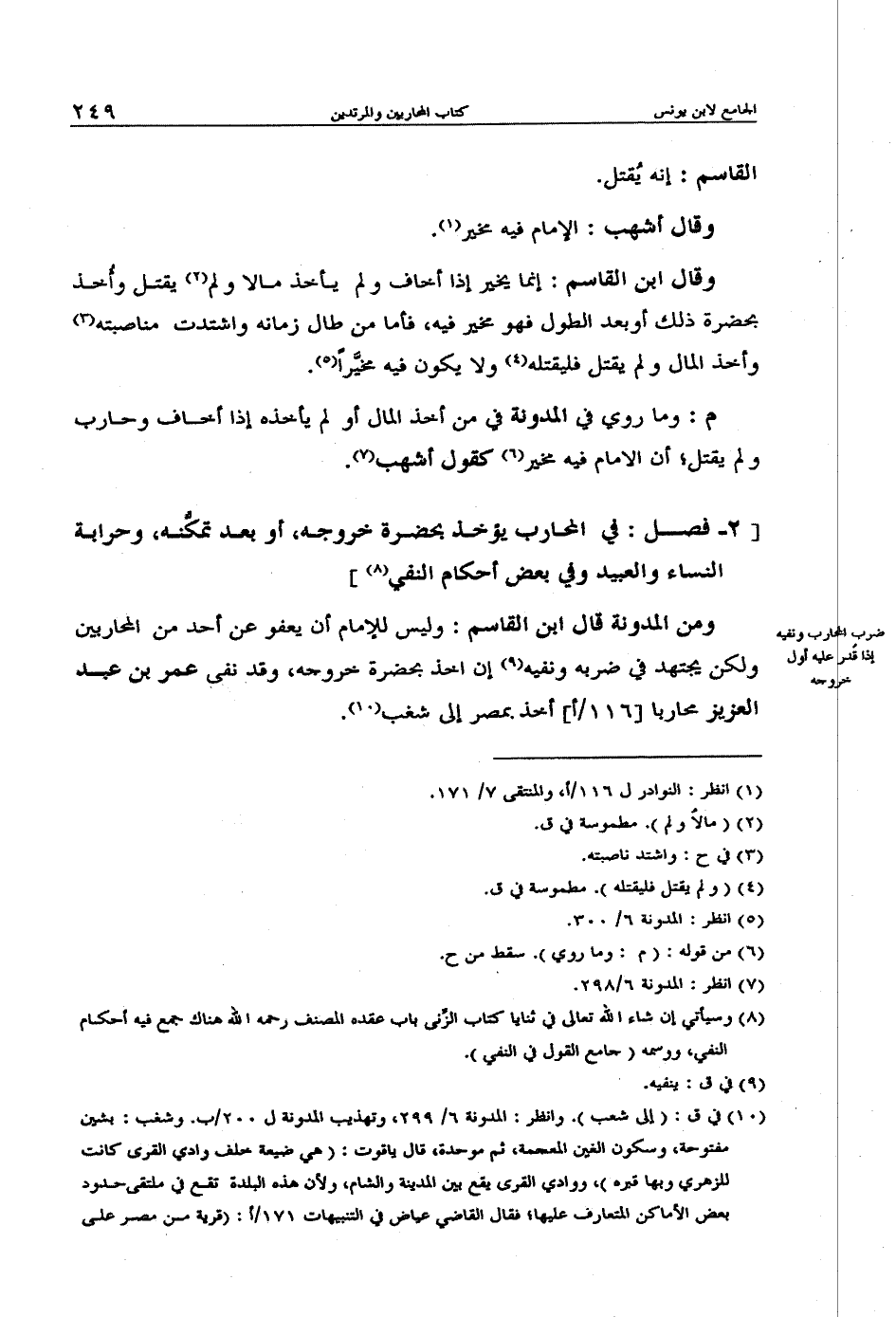 ومن المدونة قال ابن القاسم: وليس للإمام أن يعفو عن أحد من المحاربين ولكن يجتهد في ضربه ونفيه إن أخذ بحضرة خروجه، وقد نفى عمر بن عبد العزيز محارباً أخذ بمصر إلى شغب.