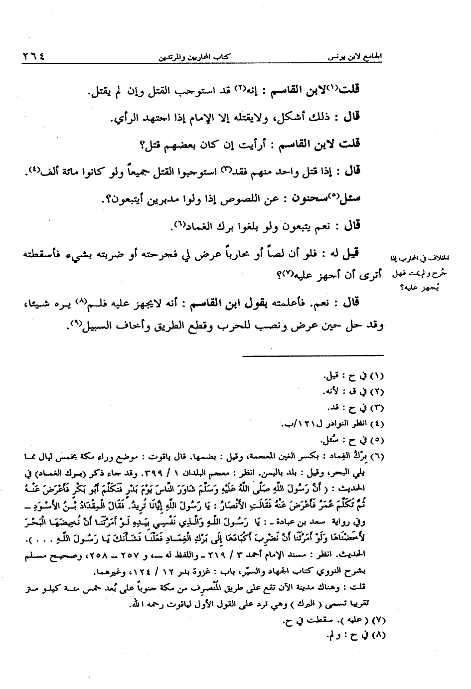 قال: نعم. فأعلمته بفول ابن القاسم: أنه لا يجهز عليه فلم يره شيئاً، وقد حل حين عرض ونصب للحرب وقطع الطريق وأخاف السبيل.