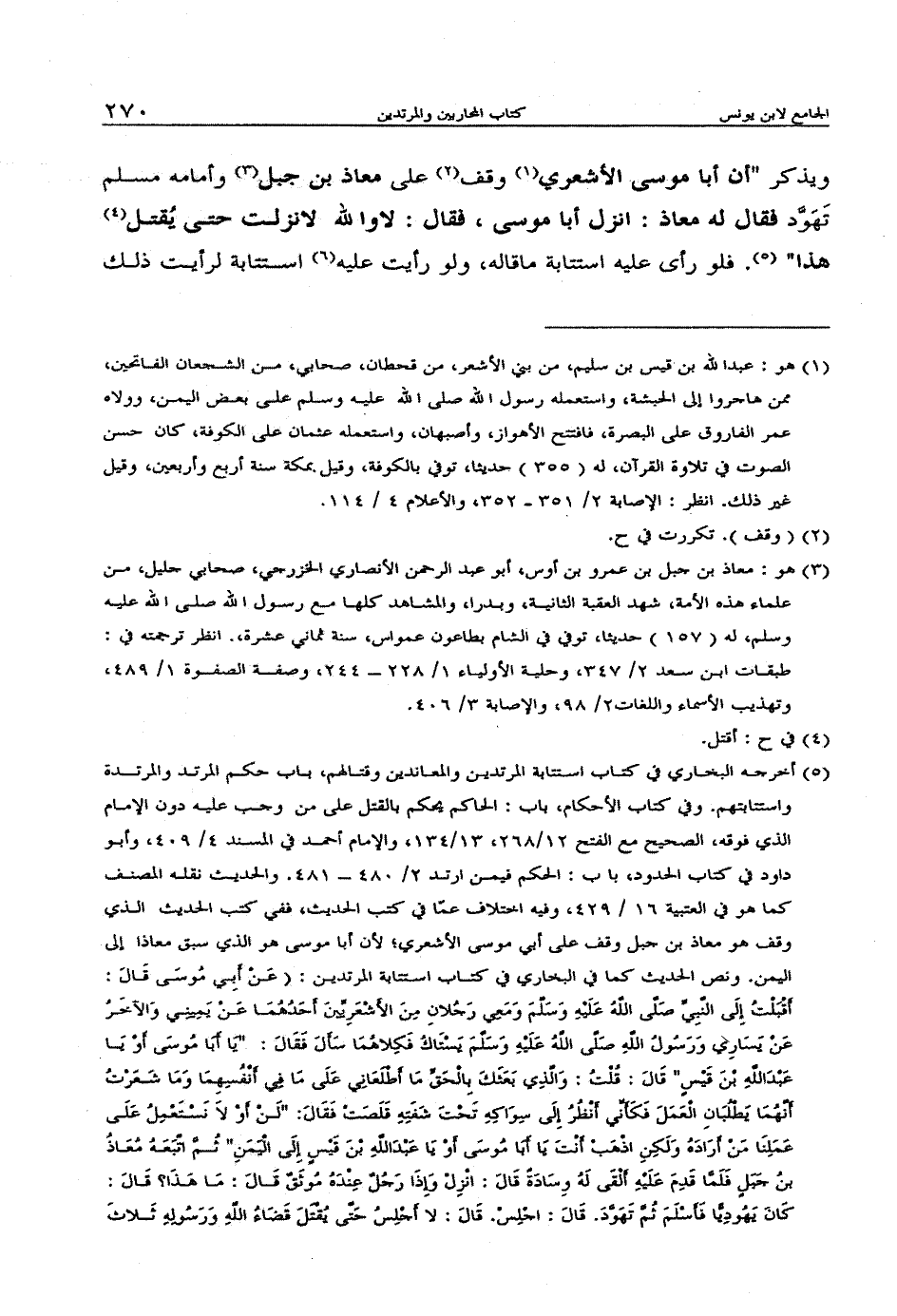 ويذكر "أن أبا موسى الأشعري وقف على معاذ بن جبل وأمامه مسلم تهود فقال له معاذ: انزل أبا موسى، فقال: لا والله لا نزلت حتى يقتل هذا". فلو رأى عليه استتابة ما قاله، ولو رأيت عليه استتابة لرأيت ذلك