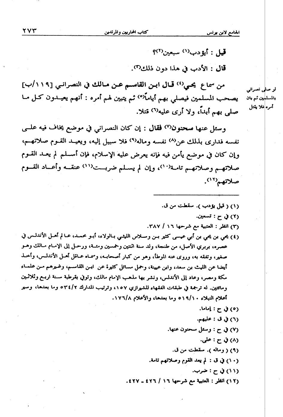 وسئل عنها سحنون فقال: إن كان النصراني في موضع يخاف فيه على نفسه فدارى بذلك عن نفسه وماله فلا سبيل إليه، ويعيد القوم صلاتهم، وإن كان موضع يأمن فيه فإنه يعرض عليه الإسلام، فإن أسلم لم يعد القوم صلاتهم وصلاتهم تامة، وإن لم يسلم ضربت عنقه وأعاد القوم صلاتهم.