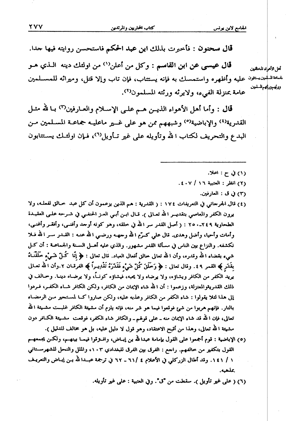 قال: وأما أهل الأهواء الذين هم على الإسلام والعارفين بالله مثل القدرية والإباضية وشبههم ممن هو على غير ما عليه جماعة المسلمين من البدع والتحريف لكتاب الله وتأويله على غير تأويل، فإن أولئك يستتابون