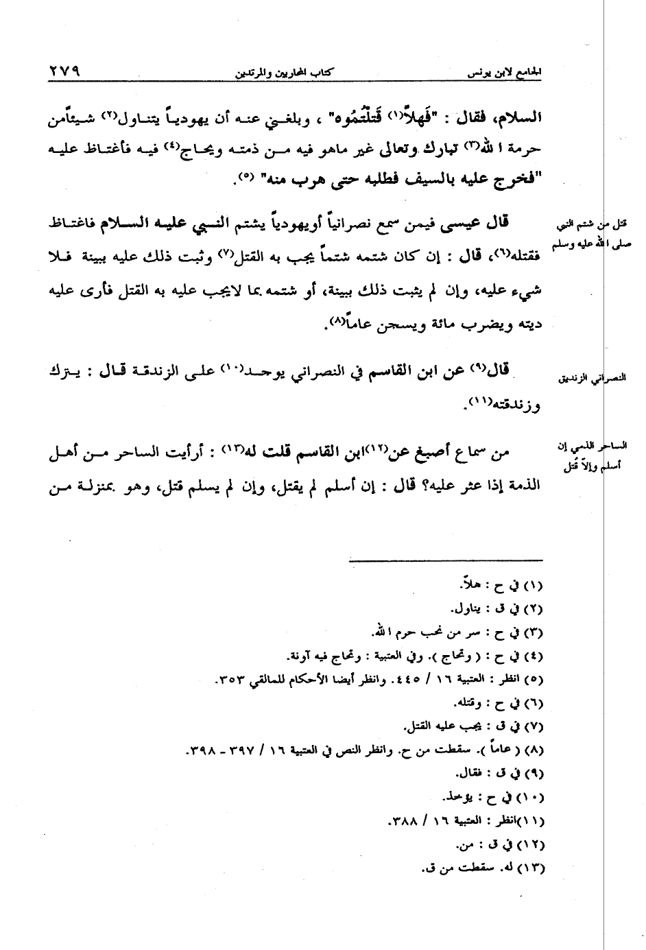 من سماع أصبغ عن ابن القاسم قلت له: أرأيت الساحر من أهل الذمة إذا عثر عليه؟ قال: إن أسلم لم يقتل، وإن لم يسلم قتل، وهو بمنزلة من