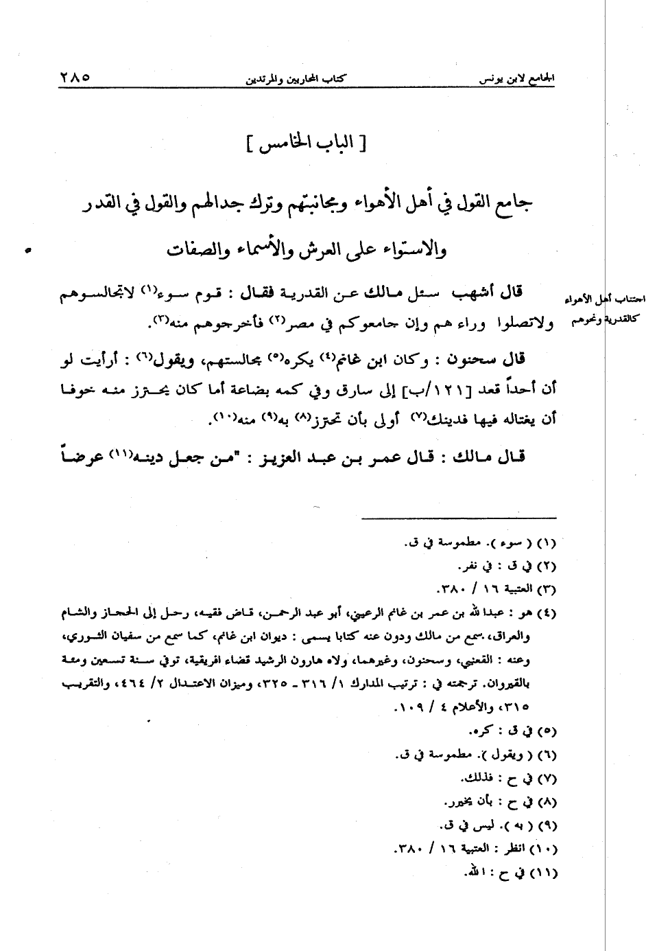قال سحنون: وكان ابن غانم يكره مجالستهم، ويقول: أرأيت لو أن أحداً قعد إلى سارق وفي كمه بضاعة أما كان يحترز منه خوفاً أن يغتاله فيها فدينك أولى بأن تحترز به منه.