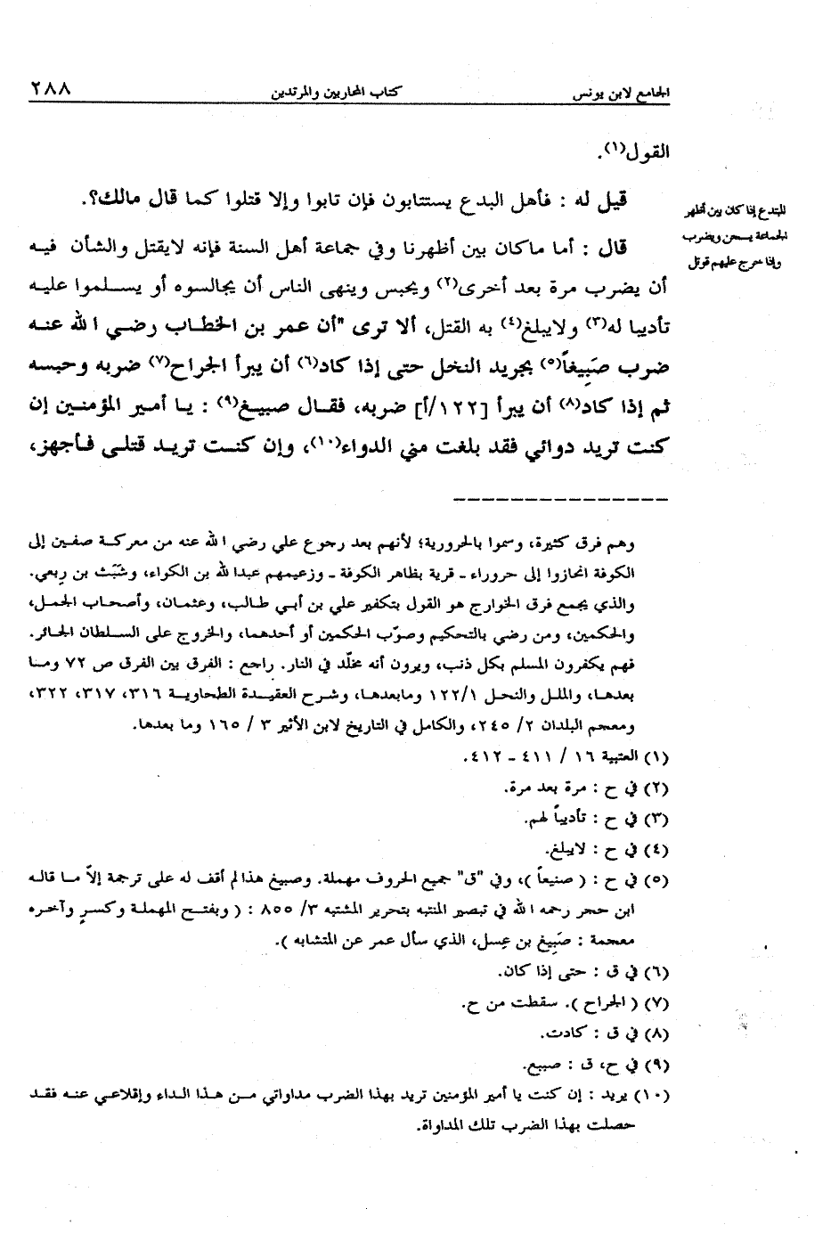 قال: أما ما كان بين أظهرنا وفي جماعة أهل السنة فإنه لا يقتل والشأن فيه أن يضرب مرة بعد أخرى ويحبس وينهى الناس أن يجالسوه أو يسلموا عليه تأديباً له ولا يبلغ به القتل، ألا ترى "أن عمر بن الخطاب رضي الله عنه ضرب صبيغاً بجريد النخل حتى إذا كاد أن يبرأ الجراح ضربه وحبسه ثم إذا كاد أن يبرأ ضربه، فقال صبيغ: يا أمير المؤمنين إن كنت تريد دوائي فقد بلغت مني الدواء، وإن كنت تريد قتلي فأجهز،