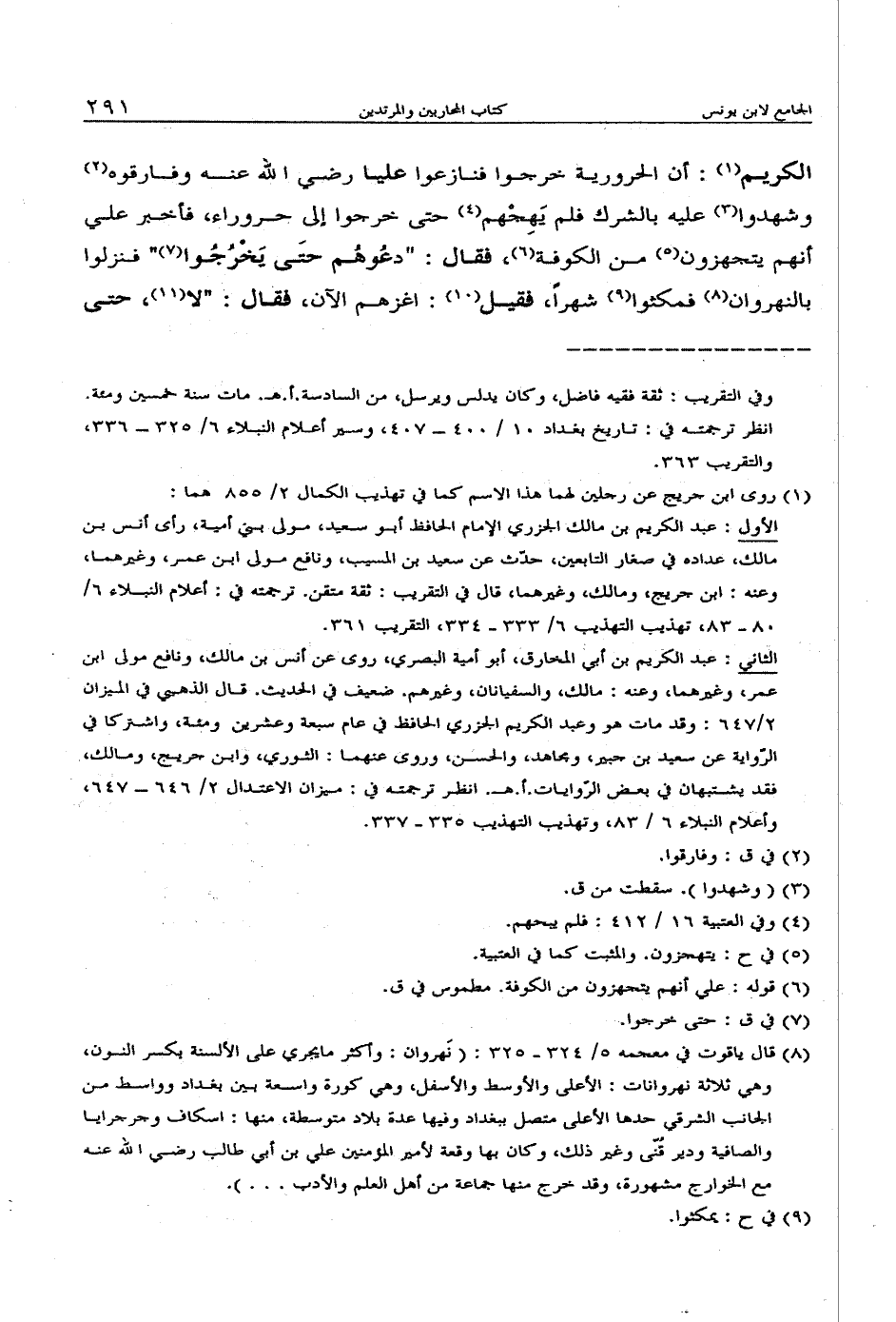 الكريم: أن الحرورية خرجوا فنازعوا علياً رضي الله عنه وفارقوه وشهدوا عليه بالشرك فلم يهجهم حتى خرجوا إلى حروراء، فأخبر علي أنهم يتجهزون من الكوفة، فقال: "دعوهم حتى يخرجوا" فنزلوا بالنهروان فمكثوا شهراً، فقيل: اغزهم الآن، فقال: "لا، حتى