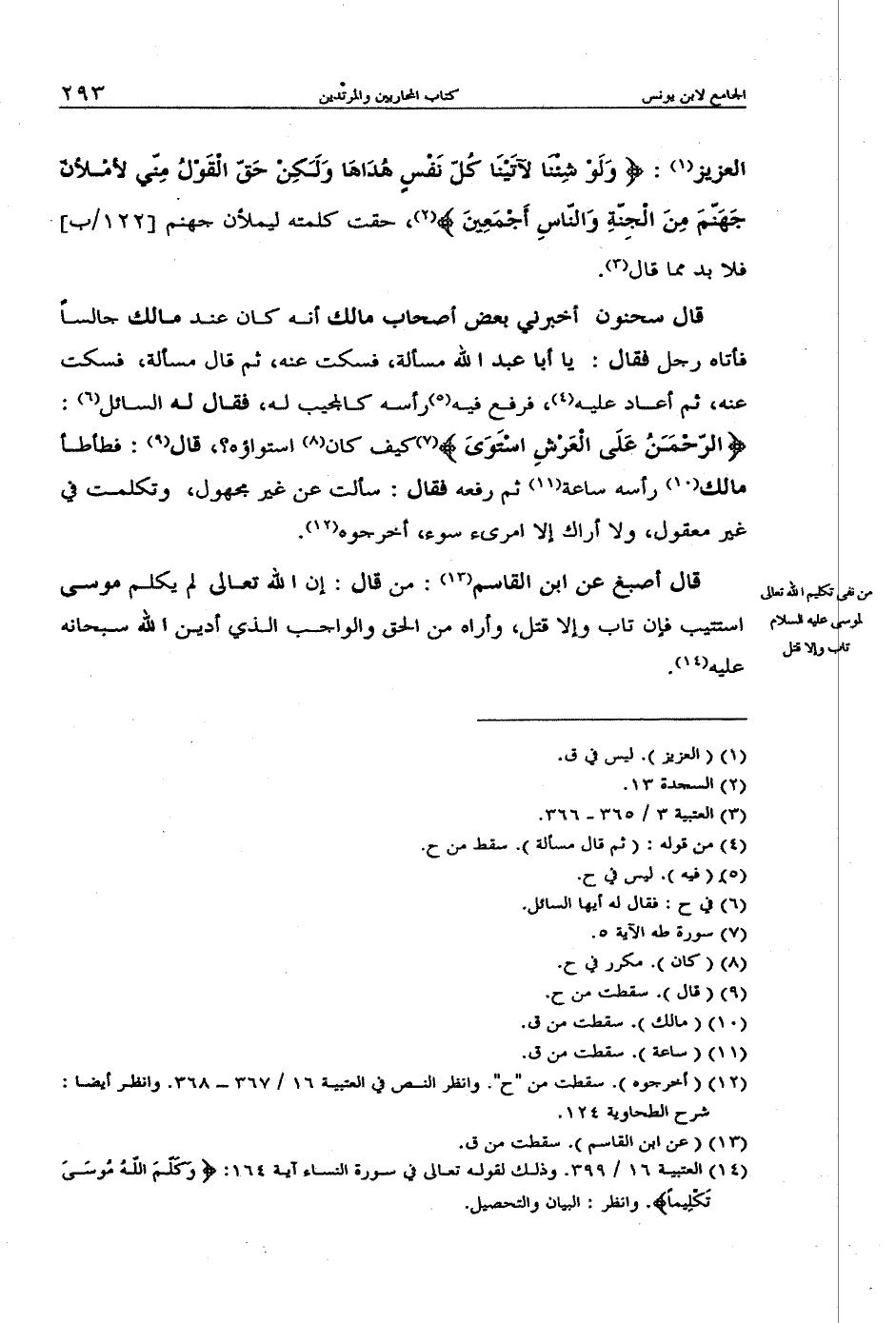 قال أصبغ عن ابن القاسم: من قال: إن الله تعالى لم يكلم موسى استتيب فإن تاب وإلا قتل، وأراه من الحق والواجب الذي أدين الله سبحانه عليه.