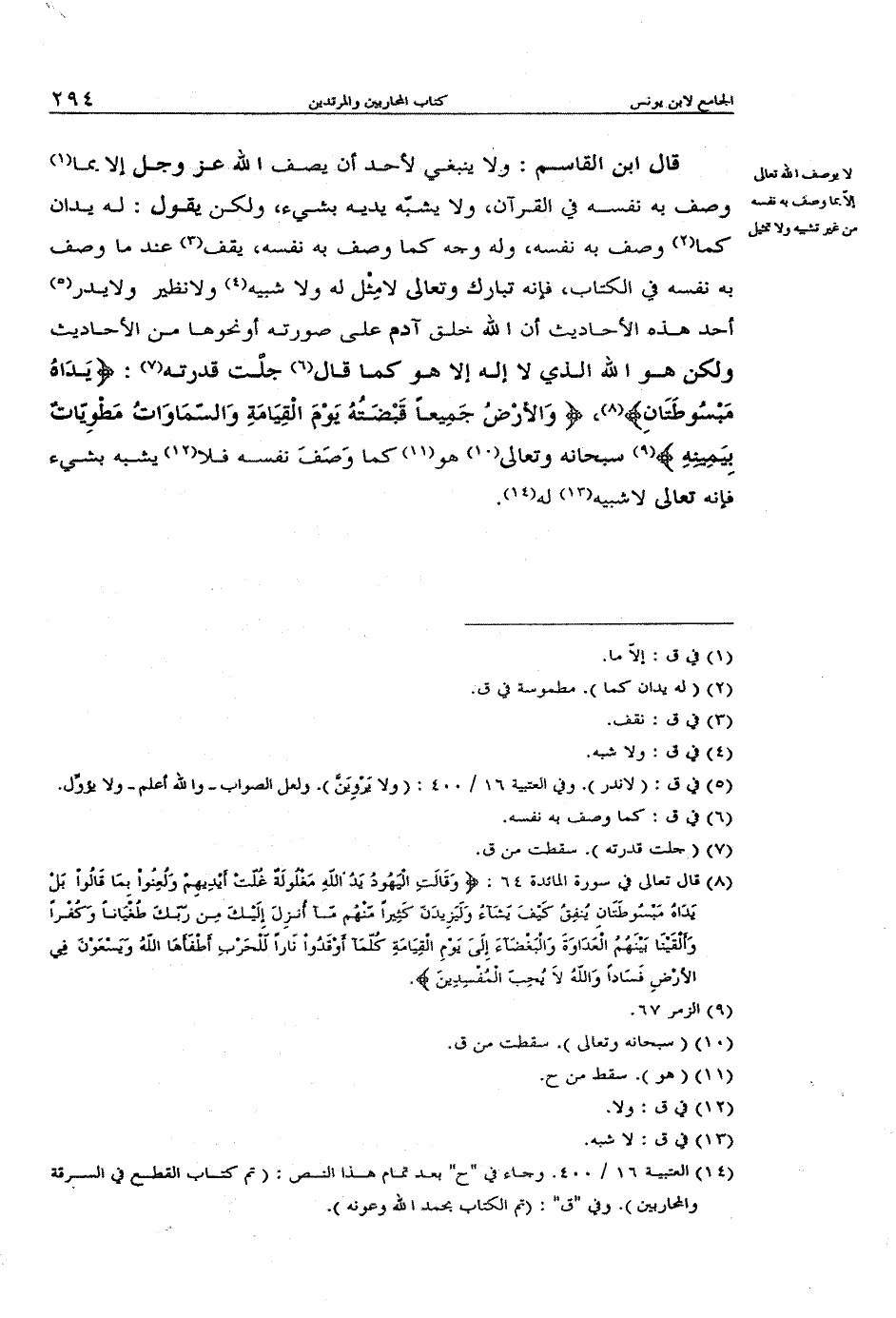 قال ابن القاسم: ولا ينبغي لأحد أن يصف الله عز وجل إلا بما وصف به نفسه في القرآن، ولا يشبه يديه بشيء، ولكن يقول: له يدان كما وصف به نفسه، وله وجه كما وصف به نفسه، يقف عند ما وصف به نفسه في الكتاب، فإنه تبارك وتعالى لا مثل له ولا شبيه ولا نظير ولا يدر أحد هذه الأحاديث أن الله خلق آدم على صورته أو نحوها من الأحاديث ولكن هو الله الذي لا إله إلا هو كما قال جلت قدرته: {يَدَاهُ مَبْسُوطَتَانِ}، {وَالْأَرْضُ جَمِيعًا قَبْضَتُهُ يَوْمَ الْقِيَامَةِ وَالسَّماوَاتُ مَطْوِيَّاتٌ بِيَمِينِهِ} سبحانه وتعالى هو كما وصف نفسه فلا يشبه بشيء فإنه تعالى لا شبيه له.