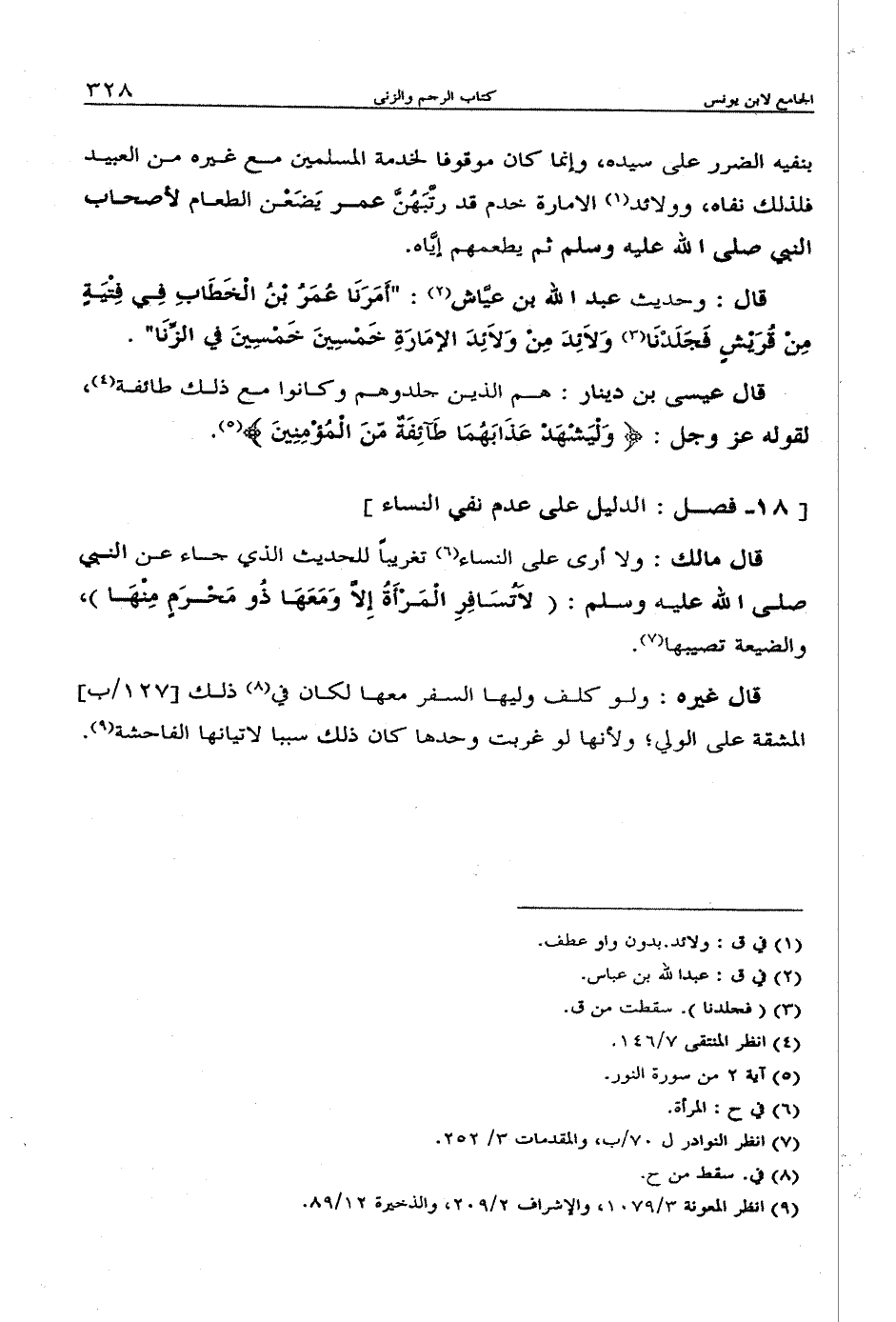 قال مالك: ولا أرى على النساء تغريباً للحديث الذي جاء عن النبي صلى الله عليه وسلم: (لا تسافر المرأة إلا ومعها دو محرمٍ منها)، والضيعة تصيبها.