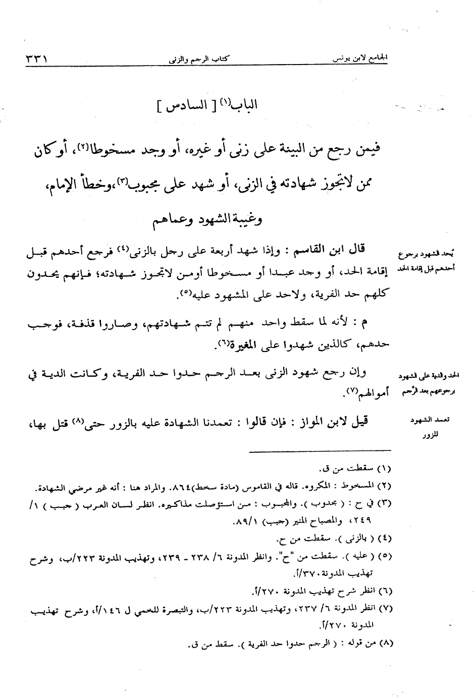 فيمن رجع من البينة على زنى أو غيره، أو وجد مسخوطاً، أو كان ممن لا تجوز شهادته في الزنى، أو شهد على مجبوب، وخطأ الإمام، وغيبة الشهود وعماهم