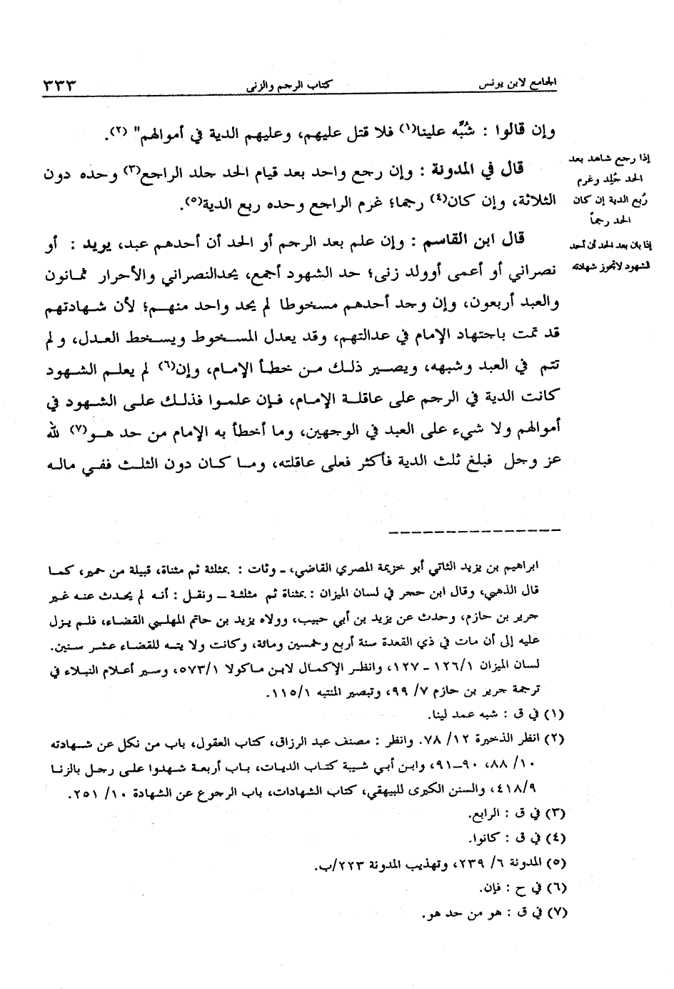 قال ابن القاسم: وإن علم بعد الرجم أو الحد أن أحدهم عبد، يريد: أو نصراني أو أعمى أو ولد زنى؛ حد الشهود أجمع، يحد النصراني والأحرار ثمانون والعبد أربعون، وإن وجد أحدهم مسخوطاً لم يحد واحد منهم؛ لأن شهادتهم قد تمت باجتهاد الإمام في عدالتهم، وقد يعدل المسخوط ويسخط العدل، ولم تتم في العبد وشبهه، ويصير ذلك من خطأ الإمام، وإن لم يعلم الشهود كانت الدية في الرجم على عاقلة الإمام، فإن علموا فذلك على الشهود في أموالهم ولا شيء على العبد في الوجهين، وما اخطأ به الإمام من حد هو لله عز وجل فبلغ ثلث الدية فأكثر فعلى عاقلته، وما كان دون الثلث ففي ماله