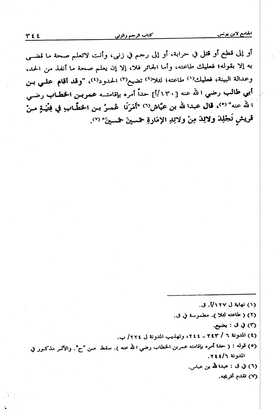 أو إلى قطع أو قتل في حرابة، أو إلى رجم في زنى، وأنت لا تعلم صحة ما قضى به إلا قوله؛ فعليك طاعته، وأما الجائر فلا، إلا أن يعلم صحة ما أنفذ من الحد، وعدالة البينة، فعليك طاعته؛ لئلا تضيع الحدود، "وقد أقام علي بن أبى طالب رضي الله عنه حداً أمره بإقامته عمر بن الخطاب رضي الله عنه"، قال عبد الله بن عياش أمرنا عمر بن الخطاب في فتية من قريش نجلد ولائد من ولائد الإمارة خمسين خمسين".