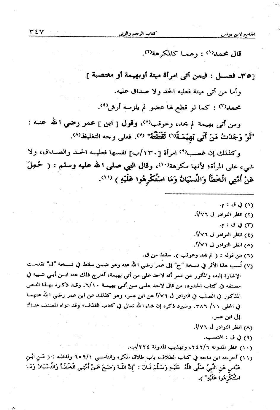 ومن أتى بهيمة لم يحد، وعوقب، وقول [ابن] عمر رضي الله عنه "لو وجدت من أتى بهيمة لقتلته". فعلى وجه التغليظ.