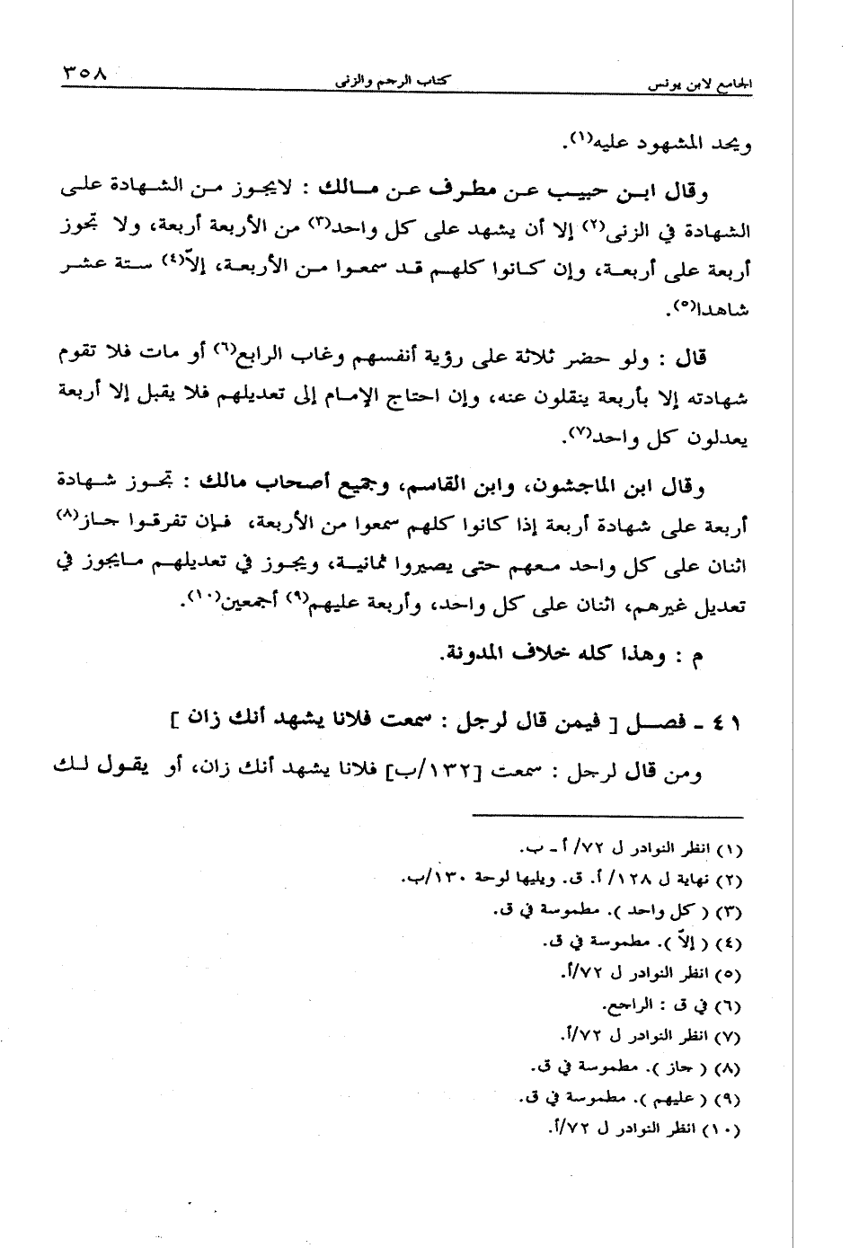 وقال ابن حبيب عن مطرف عن مالك: لا يجوز من الشهادة على الشهادة في الزنى إلا أن يشهد على كل واحد من الأربعة أربعة، ولا تجوز أربعة على أربعة، وإن كانوا كلهم قد سمعوا من الأربعة، إلّا ستة عشر شاهدا.