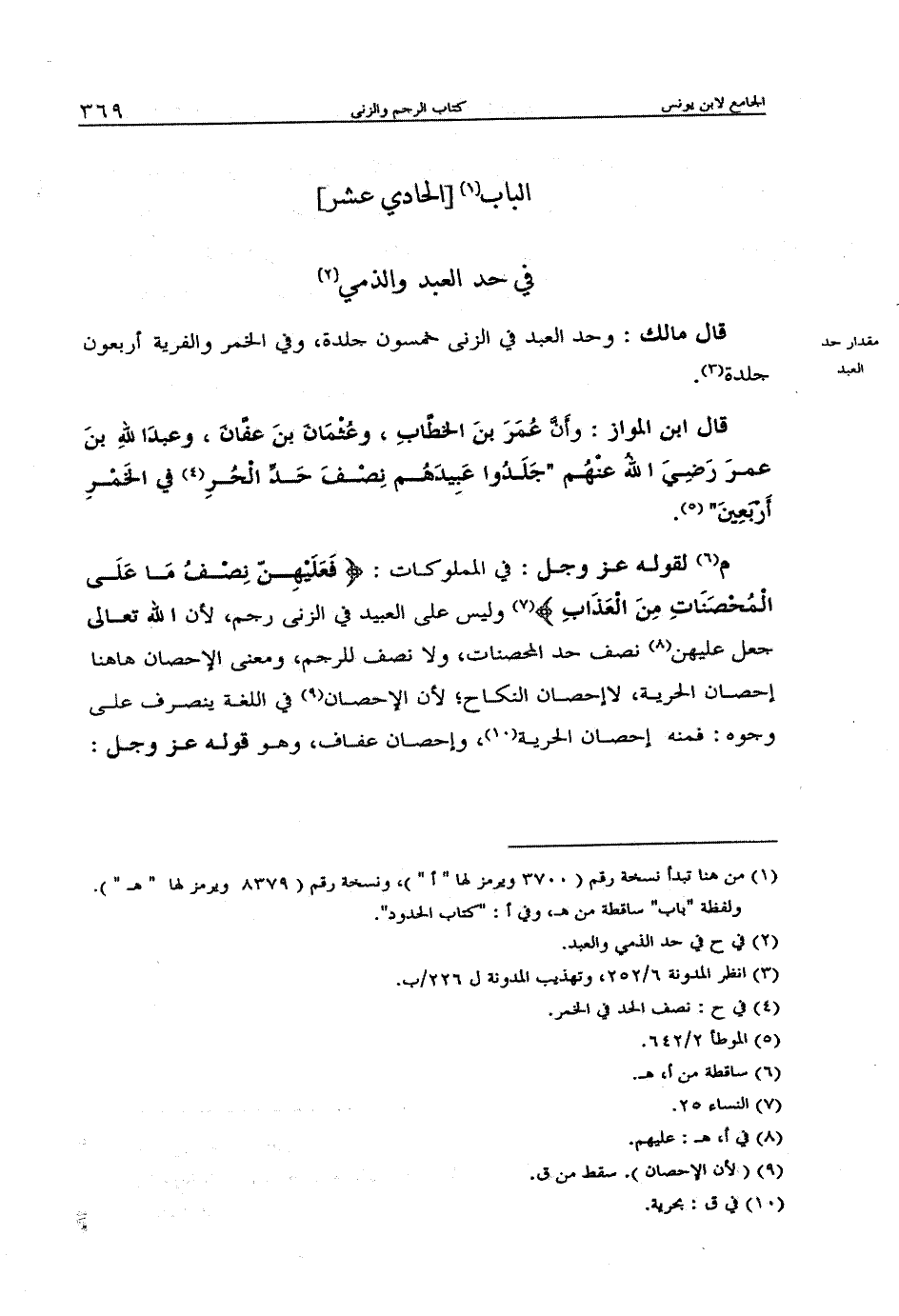 م لقوله عز وجل" في المملوكات: {فَعَلَيْهِنَّ نِصْفُ مَا عَلَى المُحْصَنَاتِ مِنَ العَذَابِ} وليس على العبيد في الزنى رجم، لأن الله تعالى جعل عليهن نصف حد المحصنات، ولا نصف للرجم، ومعنى الإحصان هاهنا إحصان الفرية، لا إحصان النكاح؛ لأن الإحصان في اللغة ينصرف على وجوه: فمنه إحصان الفرية، وإحصان عفاف، وهو قوله عز وجل:
