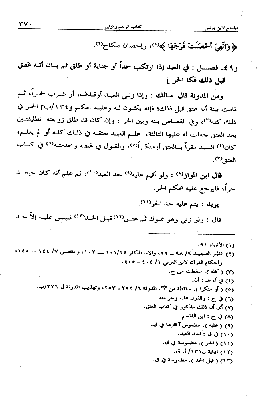 ومن المدونة قال مالك: وإذا زنى العبد أو قذف، أو شرب خمراً، ثم قامت بينة أنه عتق قبل ذلك؛ فإنه يكون له وعليه حكم الحر في ذلك كله، وفي القصاص بينه وبين الحر، وإن كان قد طلق زوجته تطليقتين بعد العتق جعلت له عليها الثالثة، علم العبد بعتقه في ذلك كله أو لم يعلم، كان السيد مقراً بالعتق أو منكراً، والقول في غلته وخدمته في كتاب العتق.