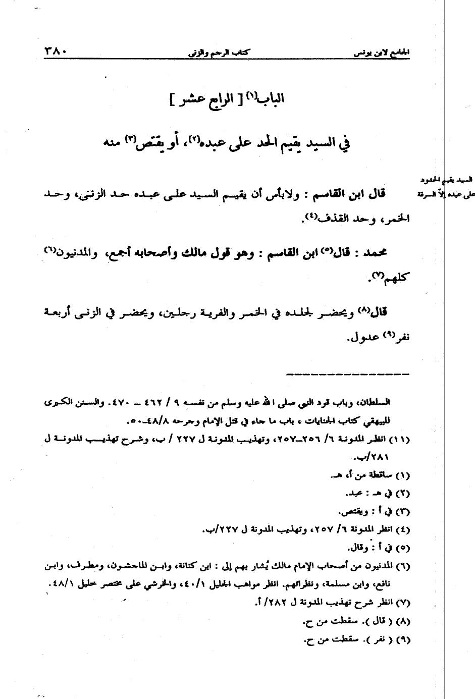 قال ابن القاسم: ولا بأس أن يقيم السيد على عبده حد الزنى، وحد الخمر، وحد القذف.