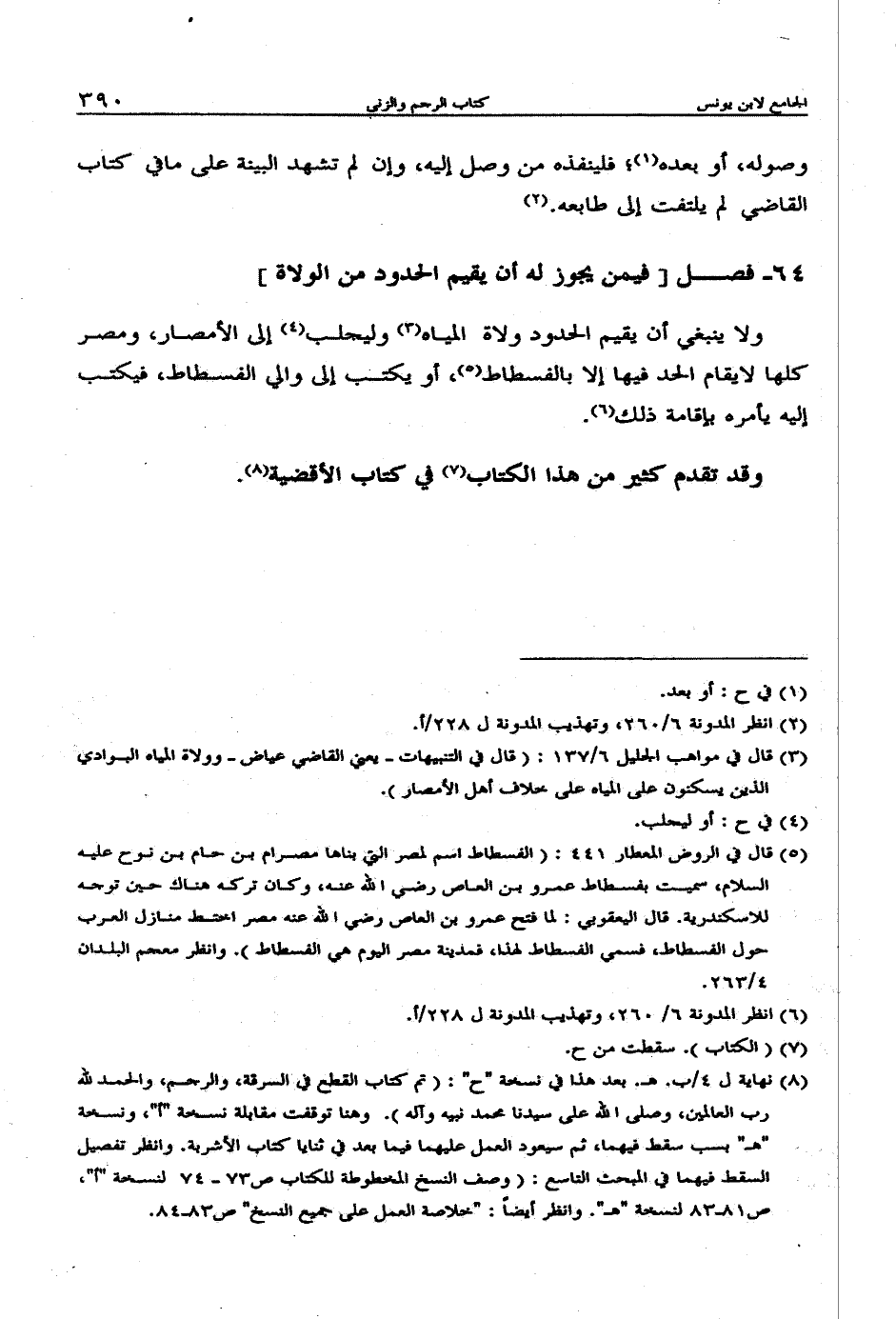 ولا ينبغي أن يقيم الحدود ولاة المياه وليجلب إلى الأمصار، ومصر كلها لا يقام الحد فيها إلا بالفسطاط، او يكتب إلى والي الفسطاط، فيكتب إليه بأمره بإقامة ذلك.