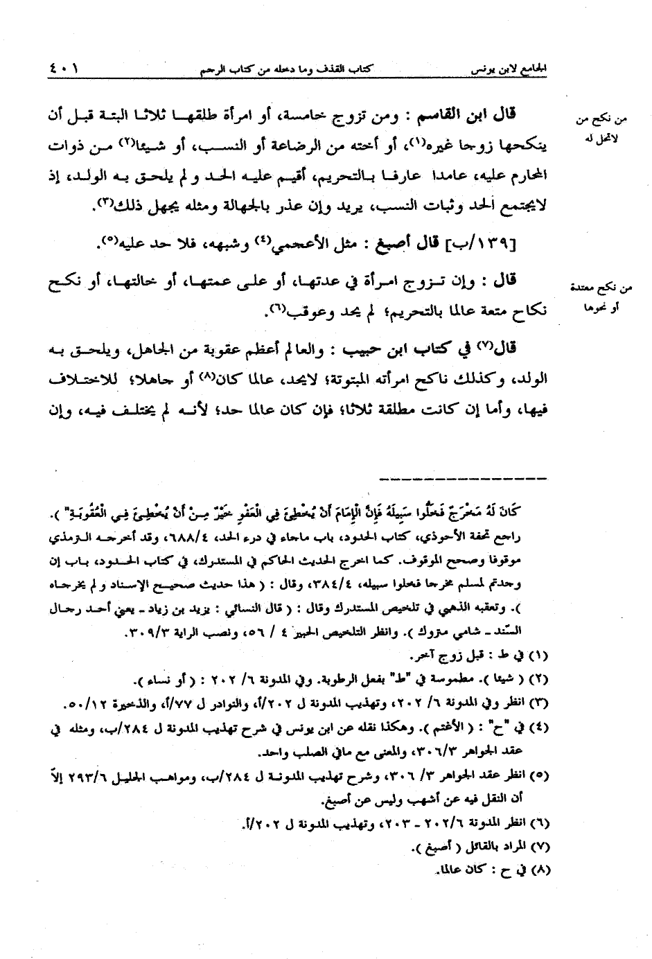 قال في كتاب ابن حبيب: والعالم أعظم عقوبة من الجاهل، ويلحق به الولد، وكذلك ناكح امرأته المبتوتة؛ لا يحد، عالما كان أو جاهلا؛ للاختلاف فيها، وأما إن كانت مطلقة ثلاثا؛ فإن كان عالما حد؛ لأنه لم يختلف فيه، وإن