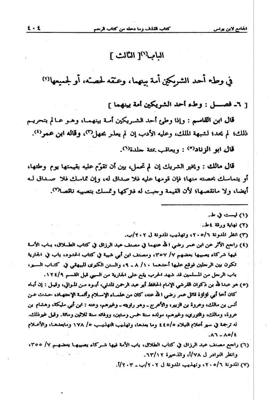 قال ابن القاسم: وإذا وطئ أحد الشريكين أمة بينهما، وهو عالم بتحريم ذلك؛ لم يحد؛ لشبهة الملك، وعليه الأدب إن لم يعذر بجهل، وقاله ابن عمر.