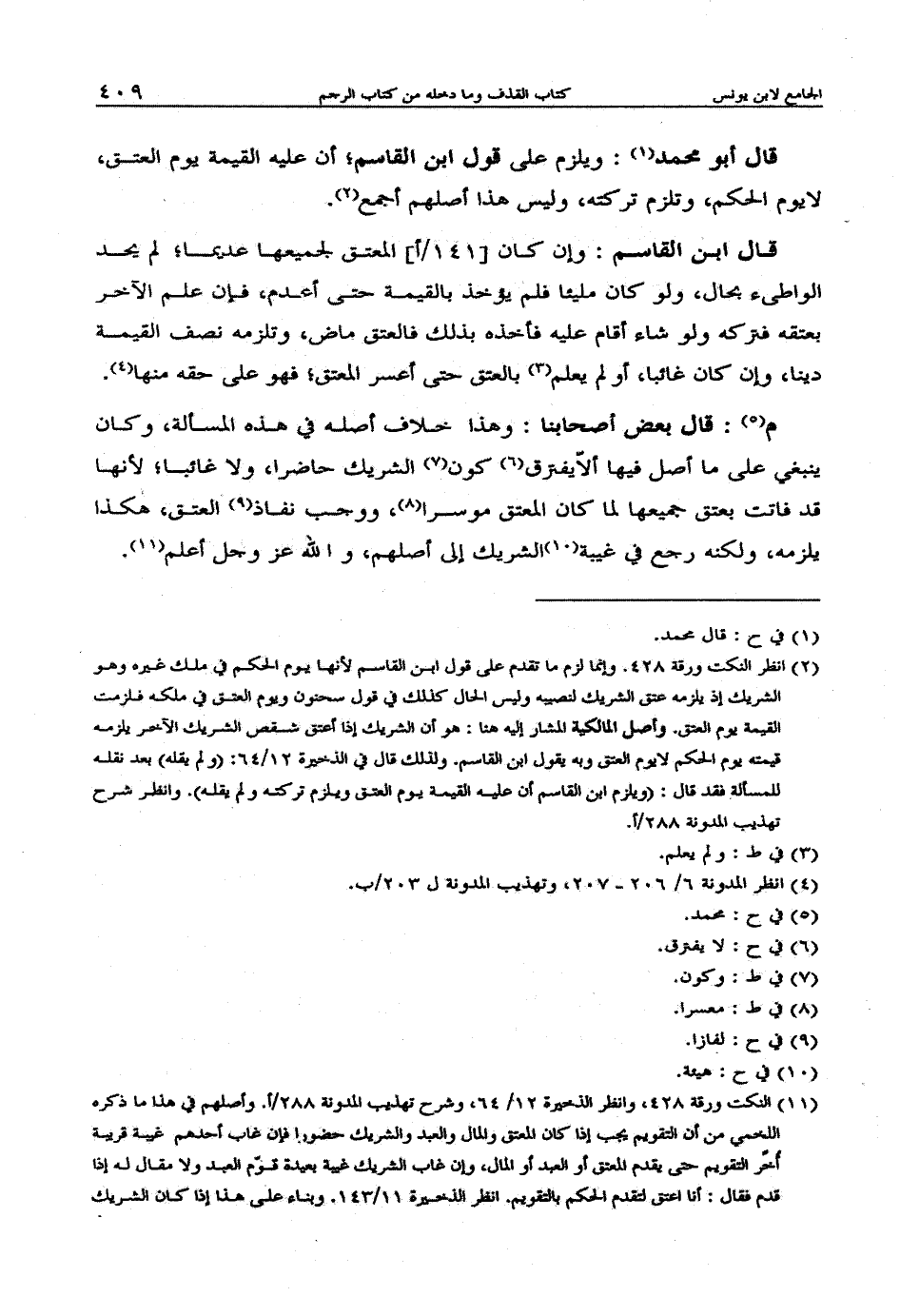 قال أبو محمد: ويلزم على قول ابن القاسم؛ أن عليه القيمة يوم العتق، لا يوم الحكم، وتلزم تركته، وليس هذا أصلهم أجمع.
