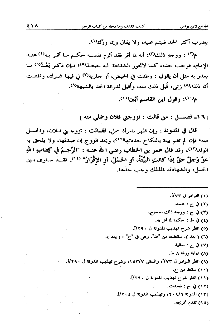 قال في المدونة: وإن ظهر بامرأة حمل، فقالت: تزوجني فلان، والحمل منه؛ فإن لم تقم بينة بالنكاح حددتها، ويحد الزوج إن صدقها، ولا يلحق به الولد، وقد قال عمر بن الخطاب رضي الله عنه: "الرجم في كتاب الله عز وجل حق إذا كانت البينة، أو الحمل، أو الإقرار"، فقد ساوى بين الحمل، والشهادة، فلذلك وجب حدها.
