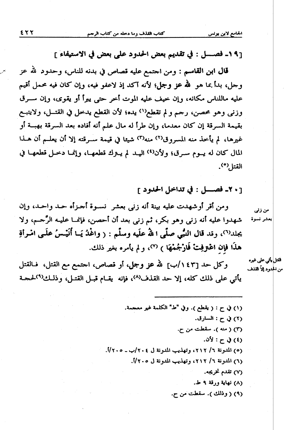 قال ابن القاسم: ومن اجتمع عليه قصاص في بدنه للناس، وحدود لله عز وجل، بدأ بما هو لله عز وجل؛ لأنه أكد إذ لا عفو فيه، وإن كان فيه محمل أقيم عليه ما للناس مكانه، وإن خيف عليه الموت أخر حتى يبرأ أو يقوى، وإن سرق وزنى وهو محصن، رجم ولم تقطع يده؛ لأن القطع يدخل في القتل، ولا يتبع بقيمة السرقة إن كان معدما، وإن طرأ له مال علم أنه أفاده بعد السرقة بهبة أو غيرها، لم يأخذ منه المسروق منه شيئا في قيمة سرقته إلا أن يعلم أن هذا المال كان له يوم سرق؛ ولأن اليد لم يترك قطعها، وإنما دخل قطعها في القتل.
