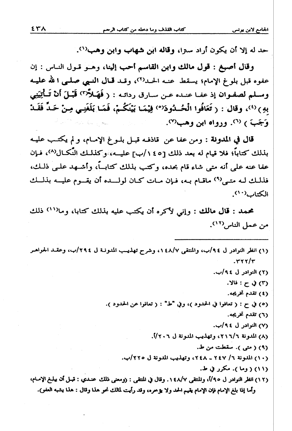 وقال أصبغ: قول مالك وابن القاسم أحب إلينا، وهو قول الناس: إن عفوه قبل بلوغ الإمام؛ يسقط عنه الحد، وقد قال النبي صلى الله عليه وسلم لصفوان إذ عفا عنده عن سارق ردائه: (فهلا قبل أن تأتيني به)، وقال: (تعافوا الحدود فيما بينكم، فما بلغني من حد فقد وجب). ورواه ابن وهب.