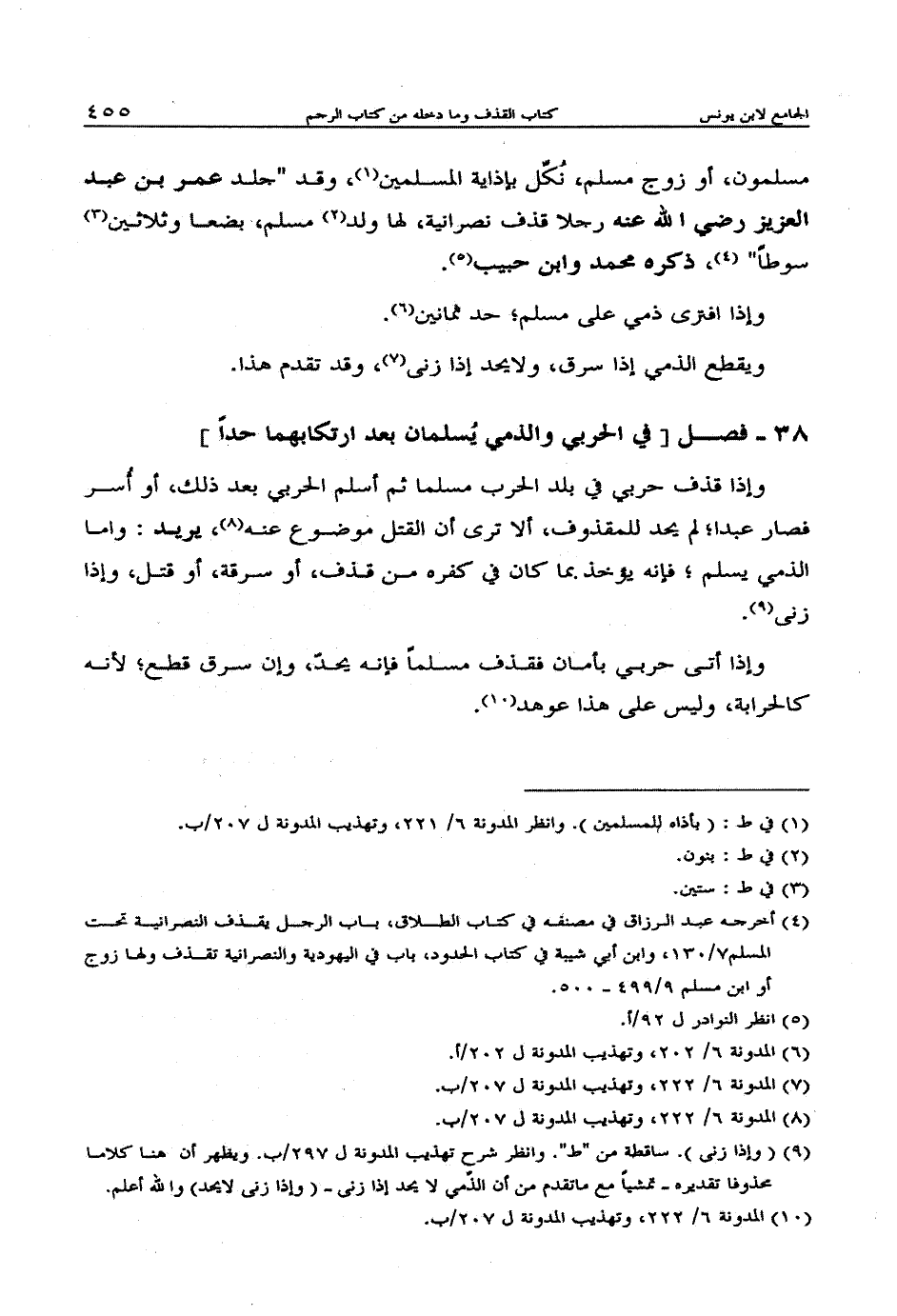 مسلمون، أو زوج مسلم، نكل بإذاية المسلمين، وقد "جلد عمر بن عبد العزيز رضي الله عنه رجلا قذف نصرانية، لها ولد مسلم، بضعا وثلاثين سوطاً"، ذكره محمد وابن حبيب.