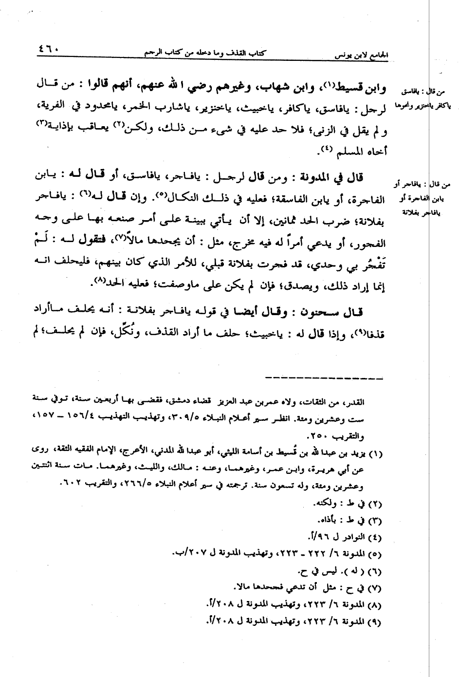 وابن قسيط، وابن شهاب، وغيرهم رضي الله عنهم، أنهم قالوا: من قال لرجل: يا فاسق، يا كافر، يا خبيث، يا خنزير، يا شارب الخمر، يا محدود في الفرية، ولم يقل في الزنى؛ فلا حد عليه في شيء من ذلك، ولكن يعاقب بإذاية أخاه المسلم.