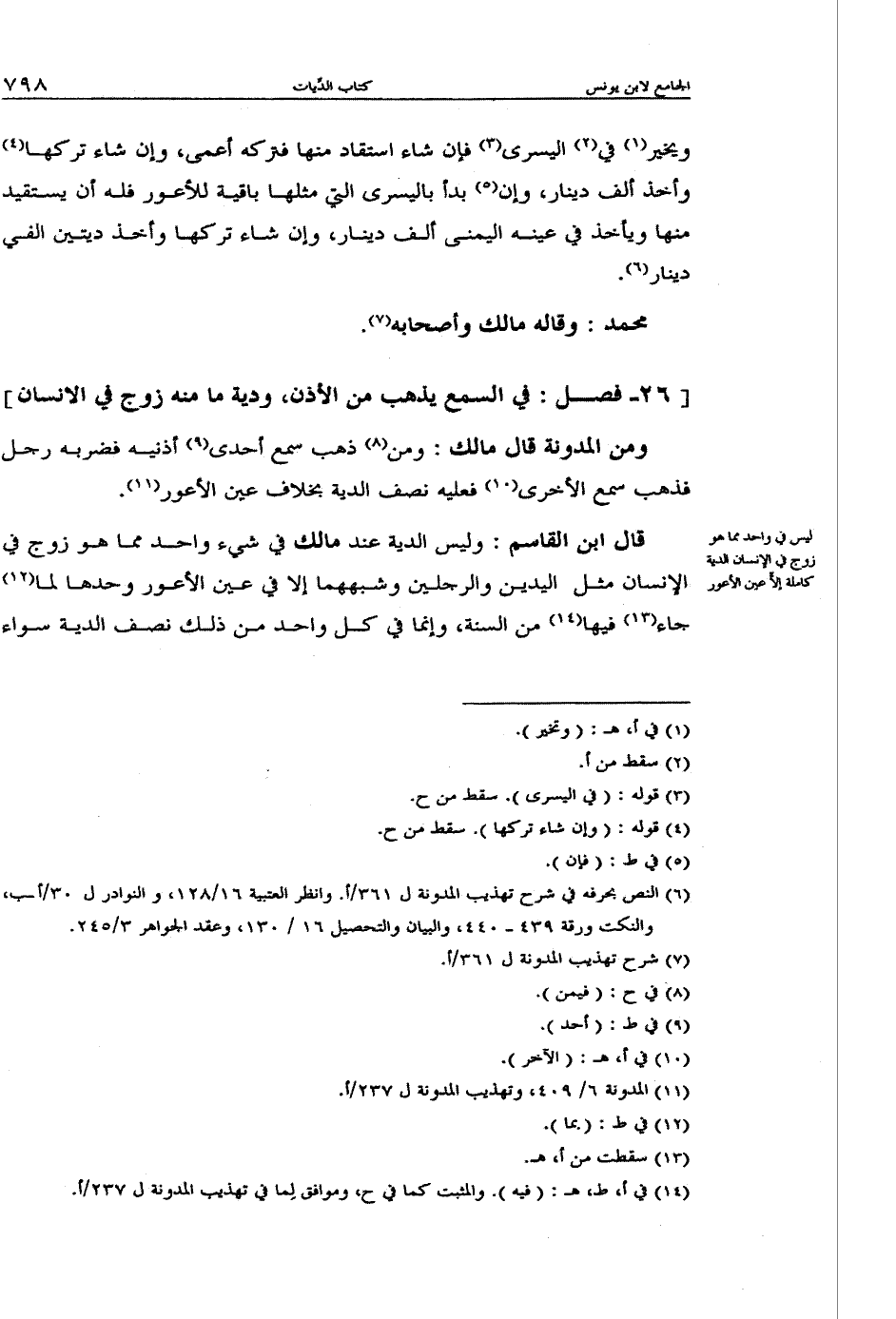قال ابن القاسم: وليس الدية عند مالك في شيء واحد مما هو زوج في الإنسان مثل اليدين والرجلين وشبههما إلا في عين الأعور وحدها لما جاء فيها من السنة، وإنما في كل واحد من ذلك نصف الدية سواء
