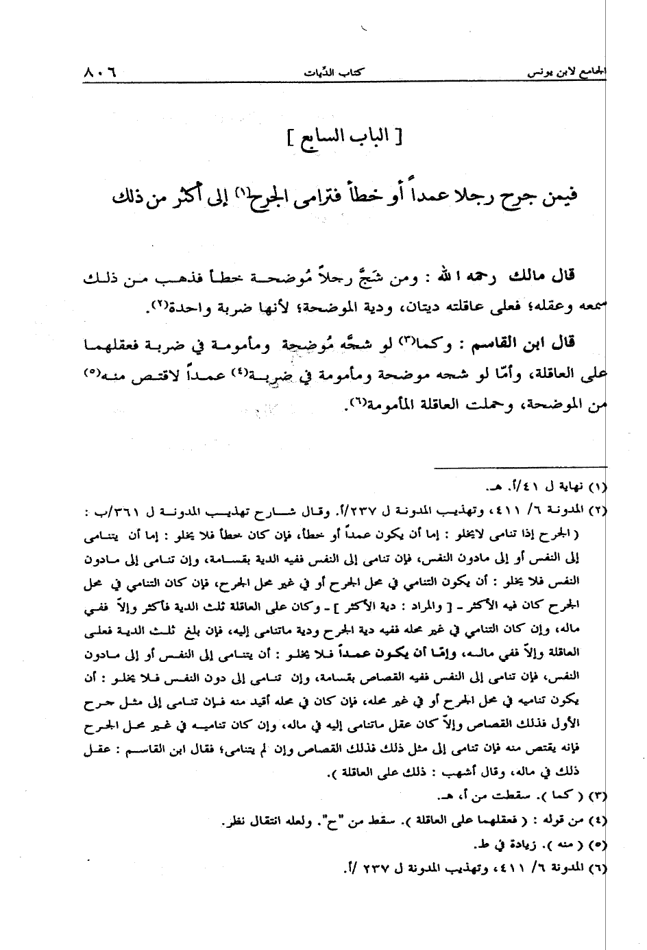 قال ابن القاسم: وكما لو شجه موضحة ومأمولة في ضربة فعقلهما على العاقلة، وأما لو شجه موضحة ومأمومة في ضربة عمداً لاقتص منه امن الموضحة، وحملت العاقلة المأمومة.