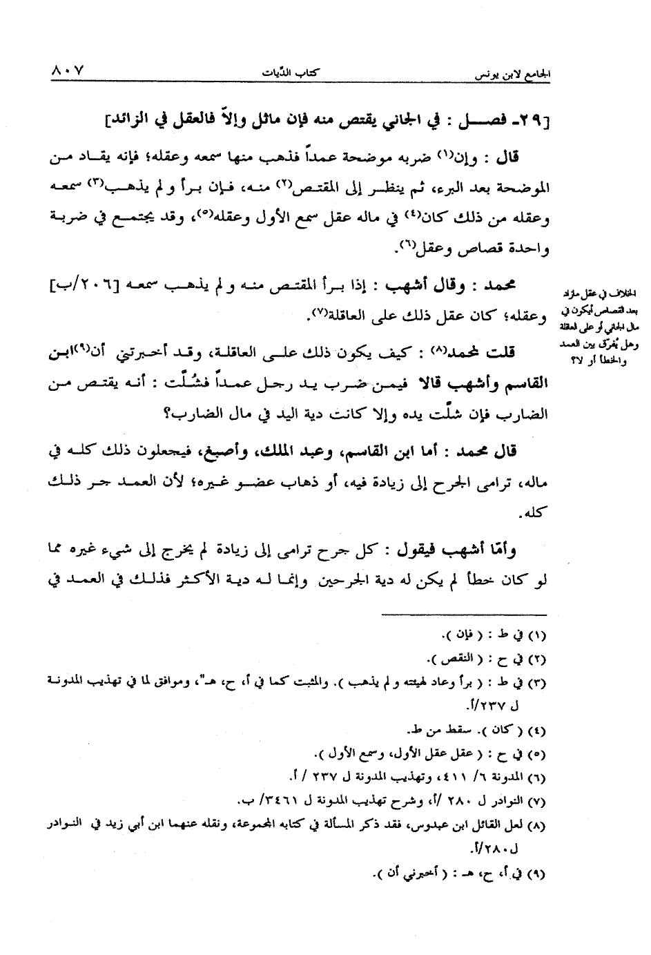 محمد: وقال أشهب: إذا برأ المقتص منه ولم يذهب سمعه [206/ب] عقله؛ كان عقل ذلك على العاقلة.