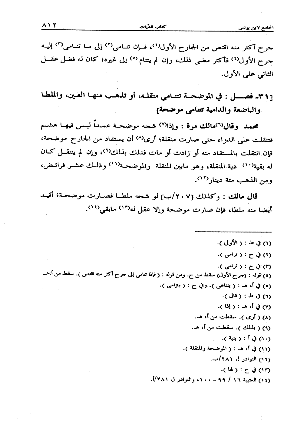 محمد: وقال مالك مرة: إذا شجه موضحة عمداً ليس فيها هشم فتنقلت على الدواء حتى صارت منقلة؛ أرى أن يستقاد من الجارح موضحة، فإن انتقلت بالمستقاد منه أو زادت أو مات فذلك بذلك وإن لم ينتقل كان له بقية دية المنقلة، وهو ما بين المنقلة والموضحة، وذلك عشر فرائض، ومن الذهب مئة دينار.
