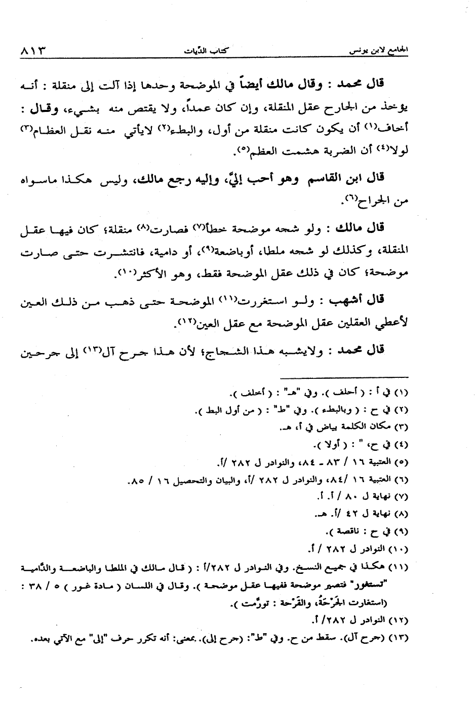 قال محمد: وقال مالك أيضا في الموضحة وحدها إذا آلت إلى منقلة: أنه يؤخذ من الجارح عقل المنقلة، وإن كان عمداً، ولا يقتص منه بشيء، وقال: أخاف أن يكون كانت منقلة من أول، والبطء لا يأتي منه نقل العظام لولا أن الضربة هشمت العظم.