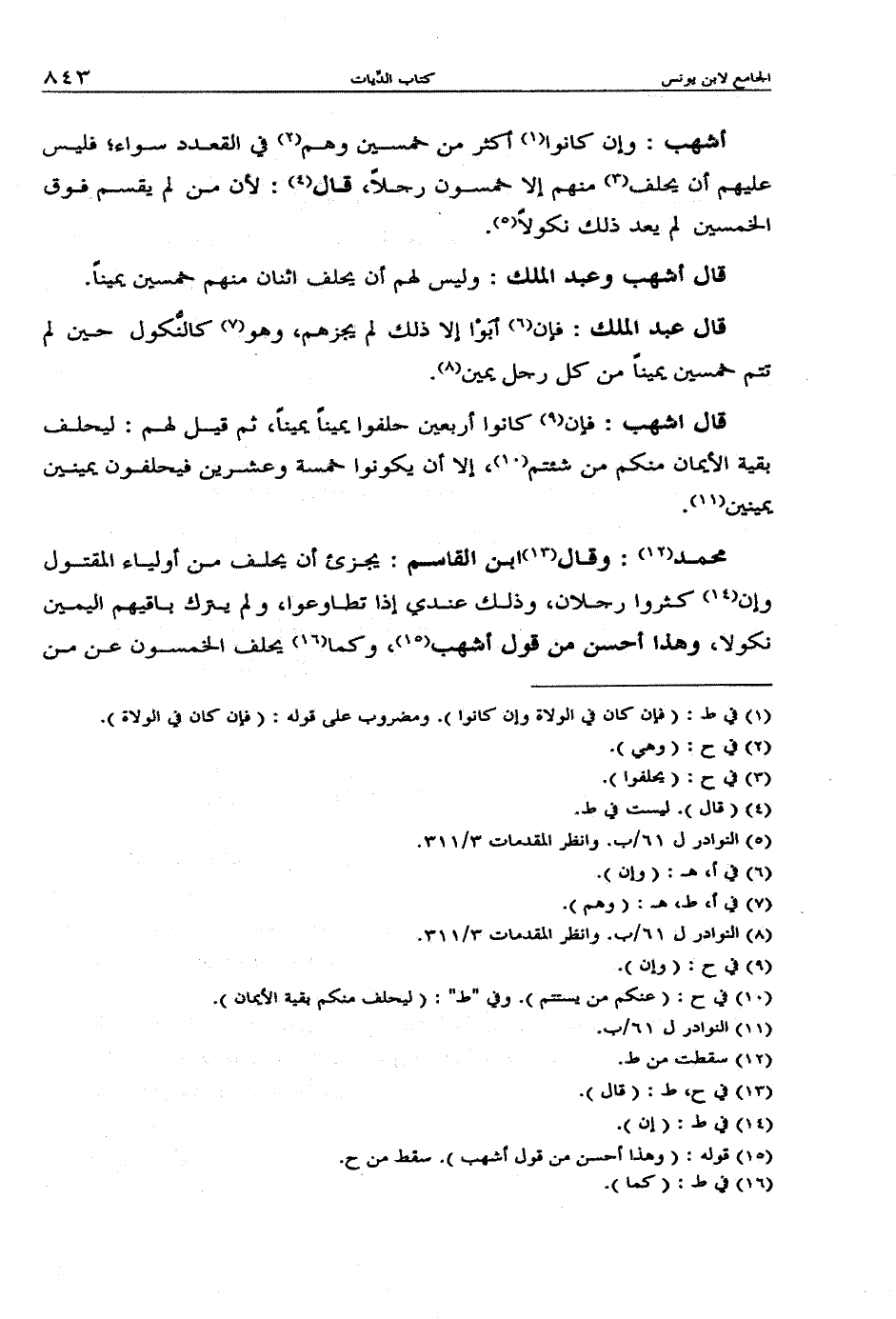 أشهب: وإن كانوا أكثر من خمسين وهم في القعدد سواء؛ فليس عليهم أن يحلف منهم إلا خمسون رجلاً، قال: لأن من لم يقسم فوق الخمسين لم يعد ذلك نكولا.