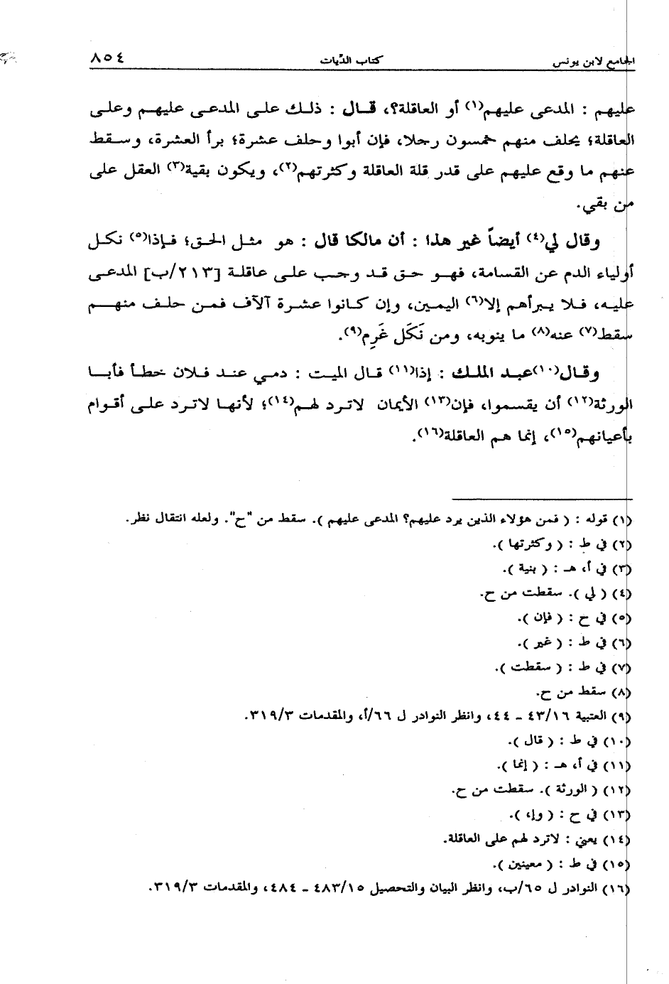 عليهم: المدعى عليهم أو العاقلة؟ قال: ذلك على المدعي عليهم وعلى العاقلة؛ يحلف منهم خمسون رجلا، فإن أبوا وحلف عشرة؛ برأ العشرة، وسقط عنهم ما وقع عليهم على قدر قلة العاقلة وكثرتهم، ويكون بقية العقل على من بقي.