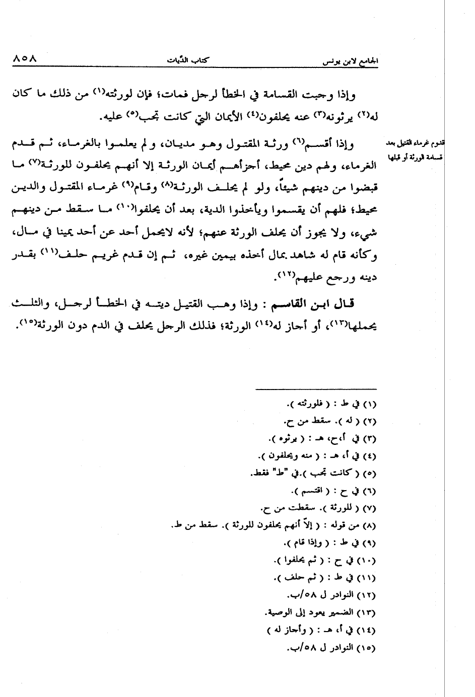 وإذا أقسم ورثة المقتول وهو مديان، ولم يعلموا بالغرماء، ثم قدم الغرماء، ولهم دين محيط، أجزأهم أيمان الورثة إلا أنهم يحلفون للورثة ما قبضوا من دينهم شيئا، ولو لم يحلف الورثة وقام غرماء المقتول والدين محيط؛ فلهم أن يقسموا ويأخذوا الدية، بعد أن يحلفوا ما سقط من دينهم شيء، ولا يجوز أن يحلف الورثة عنهم؛ لأنه لا يحمل أحد عن احد يمينا في مال، وكأنه قام له شاهد بمال أخذه بيمين غيره؛ ثم إن قدم غريم حلف بقدر دينه ورجع عليهم.