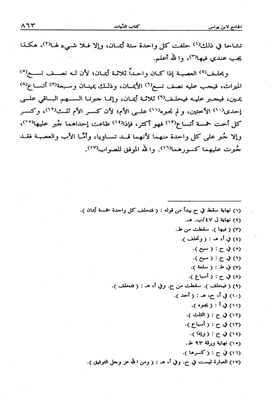 ويحلف العصبة إذا كان واحداً ثلاثة أيمان؛ لأن له نصف تسع الميراث، فيجب عليه نصف تسع الإيمان، وذلك يمينان وسبعة أتساع يمين، فيجبر عليه فيحلف ثلاثة أيمان، وإنما جبرنا السهم الباقي على إحدى الأختين، ولم نجبره على الأم؛ لأن كسر الأم ثلث، وكسر كل أخت خمسة أتساع فهو أكثر، فإذا طاعت إحدهما جبر عليها، وإلا جبر على كل واحدة منهما لأنهما قد تساويا، وأما الأب والعصبة فقد جبرت عليهما كسورهما. والله الموفق للصواب.