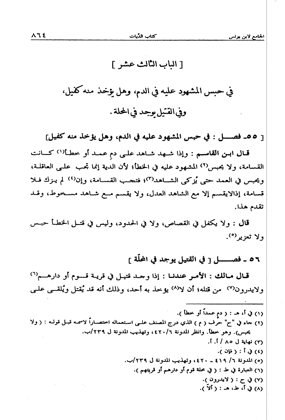 في حبس المشهود عليه في الدم، وهي يؤخذ منه كفيل،