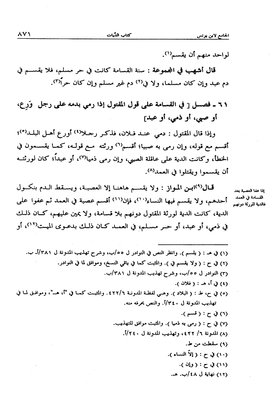 قال أشهب في المجموعة: سنة القسامة كانت في حر مسلم، فلا يقسم في دم عبد وإن كان مسلماً، ولا في دم غير مسلم وإن كان حرا.