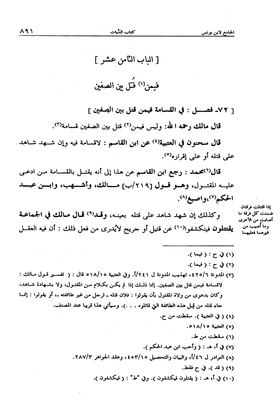 قال مالك رحمه الله: وليس فيمن قتل بين الصفين قسامة.