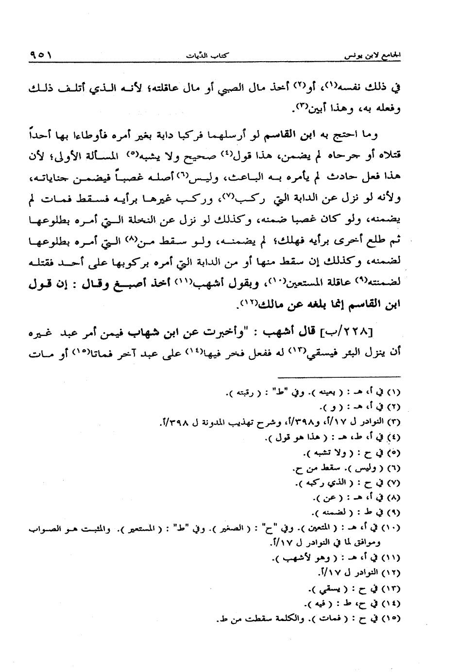 وما احتج به ابن القاسم لو أرسلهما فركبا دابة بغير أمره فأوطأ بها أحدًا قتلاه أو جرحاه لم يضمن، هذا قول صحيح ولا يشبه المسألة الأولى؛ لأن هذا فعل حادث لم يأمره به الباعث، وليس أصله غضبًا فيضمن جناياته، ولأنه لو نزل عن الدابة التي ركب، وركب غيرها برأيه فسقط فمات لم يضمنه، ولو كان غضبا ضمنه، وكذلك لو نزل عن النخلة التي أمره بطلوعها ثم طلع أخرى برأيه فهلك؛ لم يضمنه، ولو سقط من التي أمره بطلوعها لضمنه، وكذلك إن سقط منها أو من البداية التي أمره بركوبها على أحد فقتله لضمنته عاقلة المستعين، وبقول أشهب أخذ أصبغ وقال: إن قول ابن القاسم إنما بلغه عن مالك.
