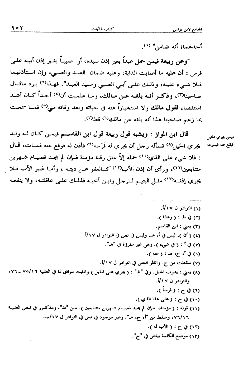 "وعن ربيعة فيمن حمل عبدًا بغير إذن سيده، أو صبيًا بغير إذن أبيه على فرس: أن عليه ما أصابت الدابة، وعليه ضمان العبد والصبي، وإن استأذنهما فلا شيء عليه، وذلك على أبي الصبي وسيد العبد". فهذا يرد ما قال صاحبنا، وذكر أنه بلغه عن مالك، وما علمت أن أحدًا كان أشد استقصاء لقول مالك ولا استخبارًا عنه في حياته وبعد وفاته مني فما سمعت بما زعم صاحبنا هذا أنه بلغه عن مالك قط.